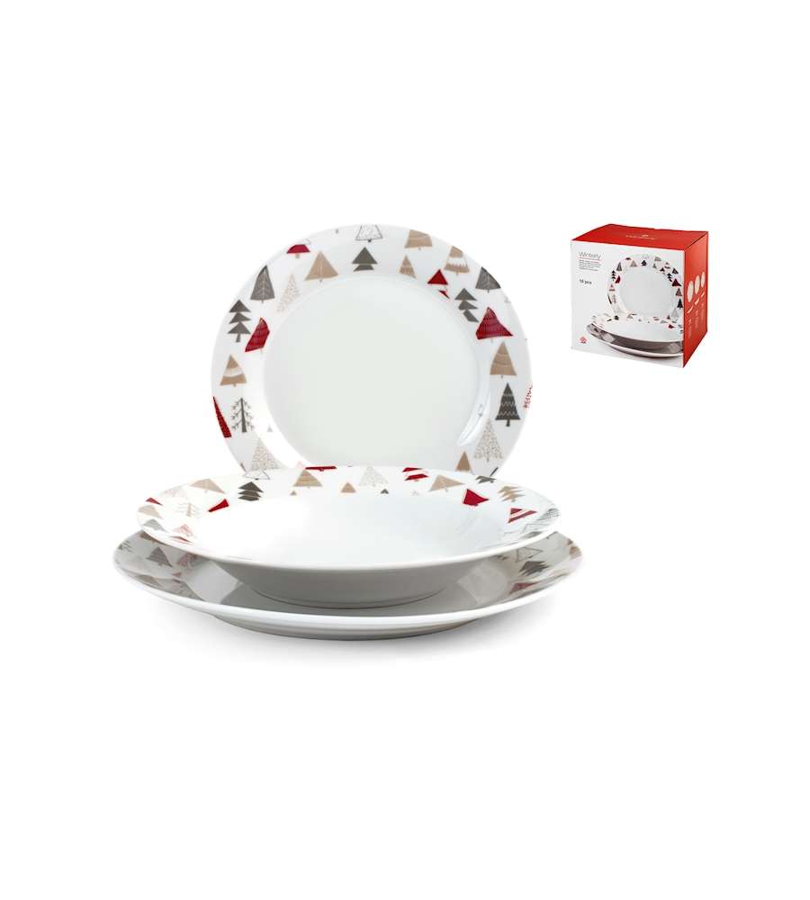 Servizio di piatti in fine porcellana, decorato con alberi natalizi. Include 6 piatti piani da 24 cm, 6 fondi 21,5 cm e 6 piatti frutta 19 cm. Lavabile in lavastoviglie e adatto al microonde, perfetto per le festività e pranzi in famiglia.Uso interno: