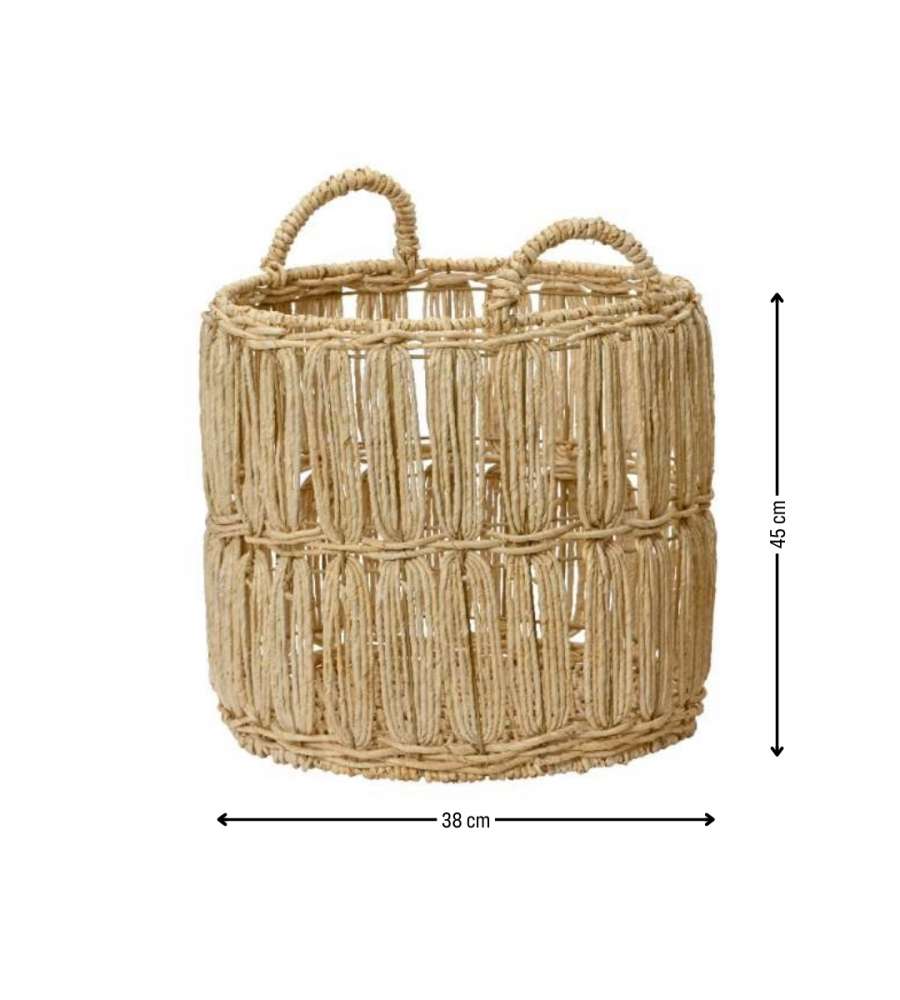 Descrizione: Cesta grande in fibra di mais, colore naturale. Con manici in corda intrecciata, misura 38x45 cm, perfetta per decorare gli interni con stile. Rifinita a mano, resistente e versatile.