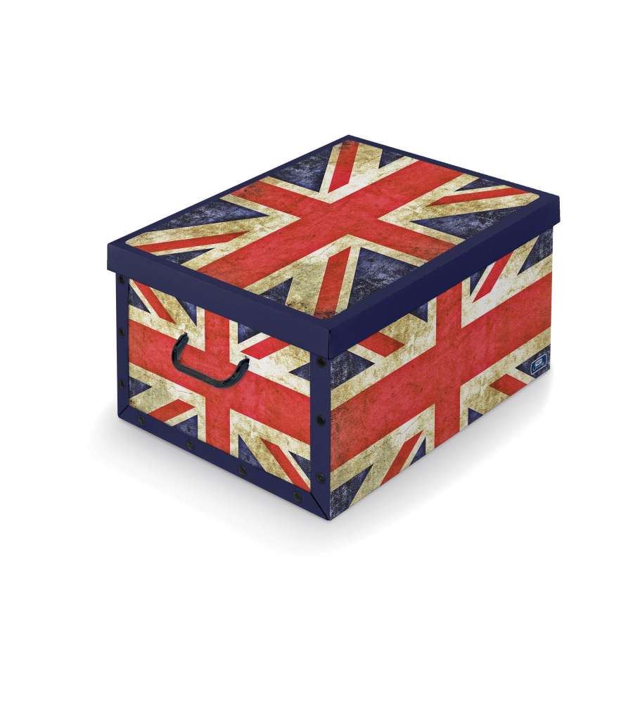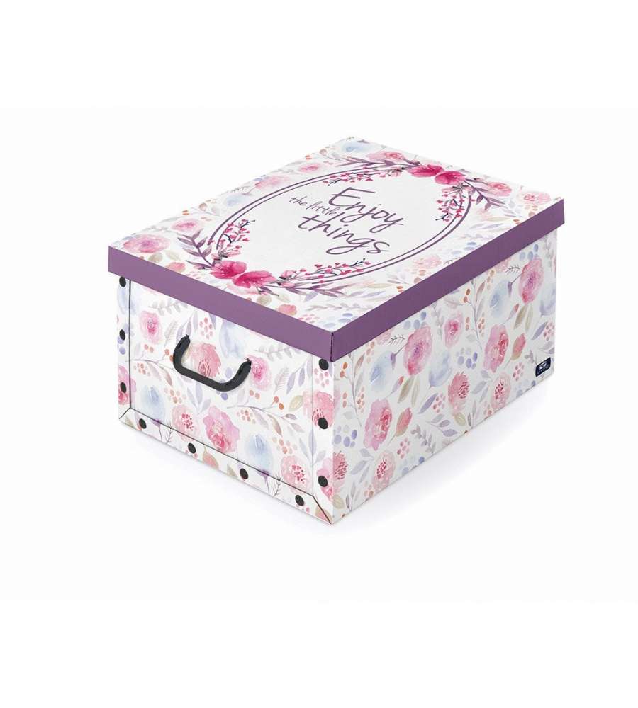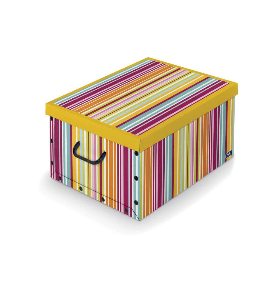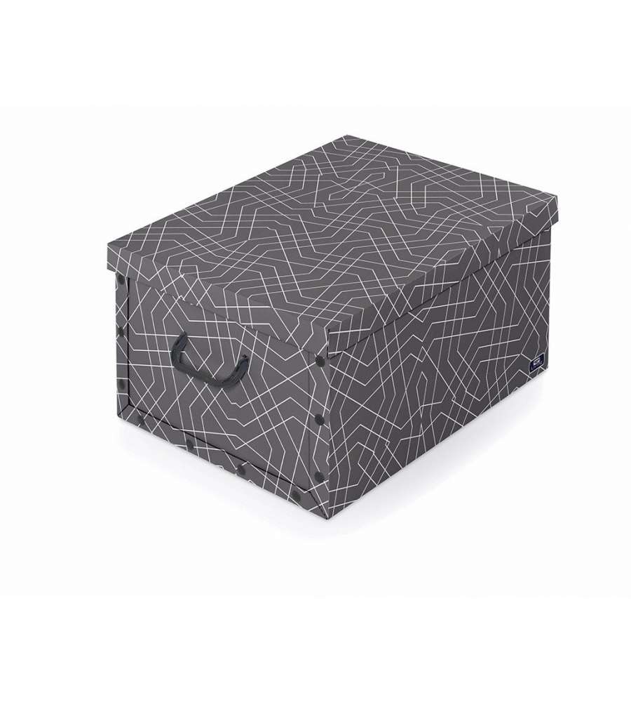 Scatola in cartone Domopak con maniglie e bottoni, dimensioni 39 x 50 x 24 cm. Facile montaggio, protegge da tarme e polvere. Disponibile in varie fantasie.