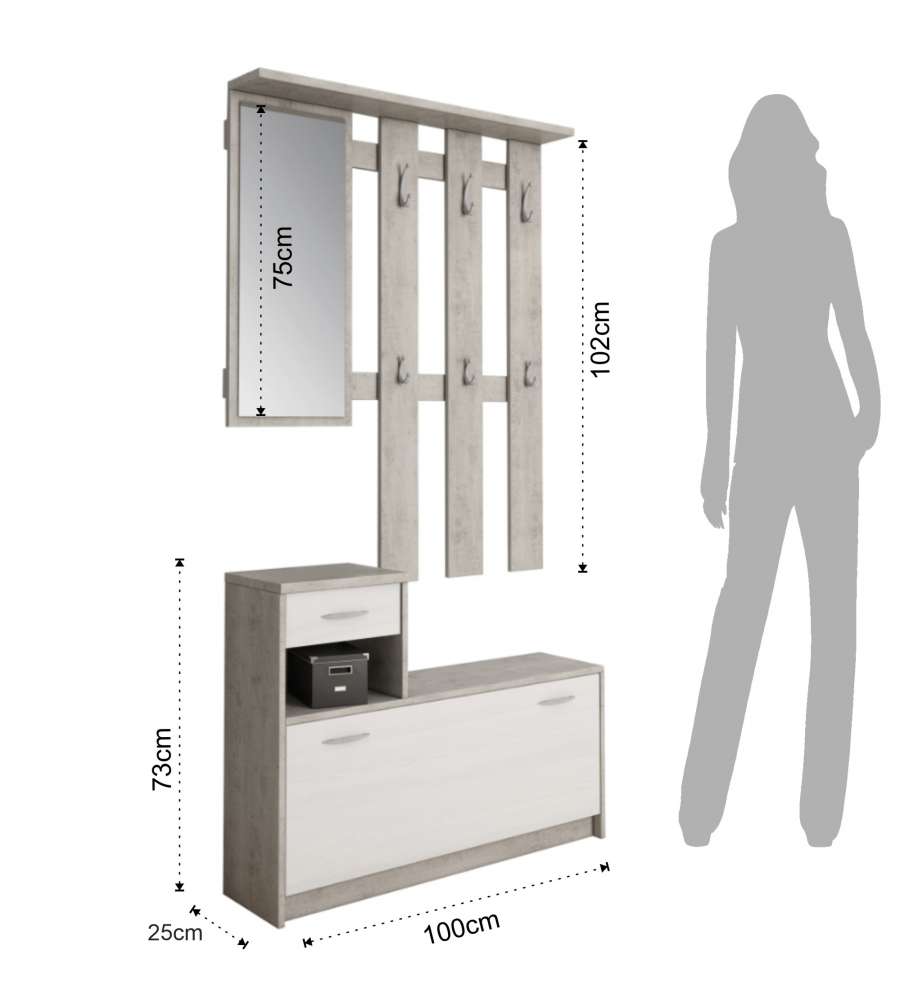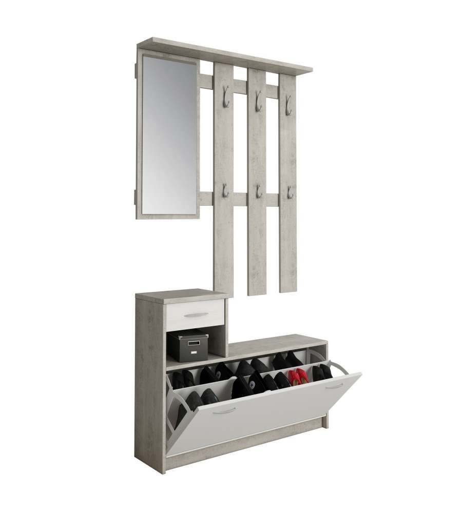 Mobile ingresso Ken Vera, in pannelli ecologici, finitura Cemento e Larice Bianco. Include 1 cassetto, 1 scarpiera, 1 vano giorno, 6 ganci e specchio. Dimensioni scarpiera: 100x25x73 cm. Pratico ed elegante per ogni ingresso.Ripiani: