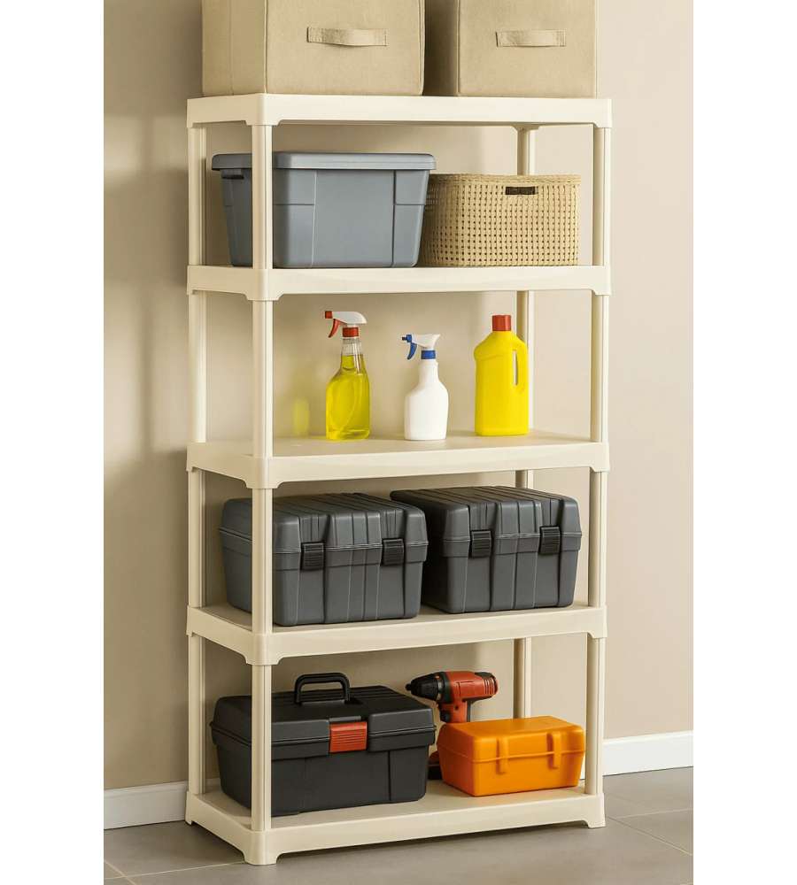Descrizione: Scaffale 5 ripiani ecrù Art Plast, in polipropilene resistente e antiurto. Facile da assemblare, lavabile e senza odori. Ideale per garage o casa, supporta fino a 30 kg per ripiano.