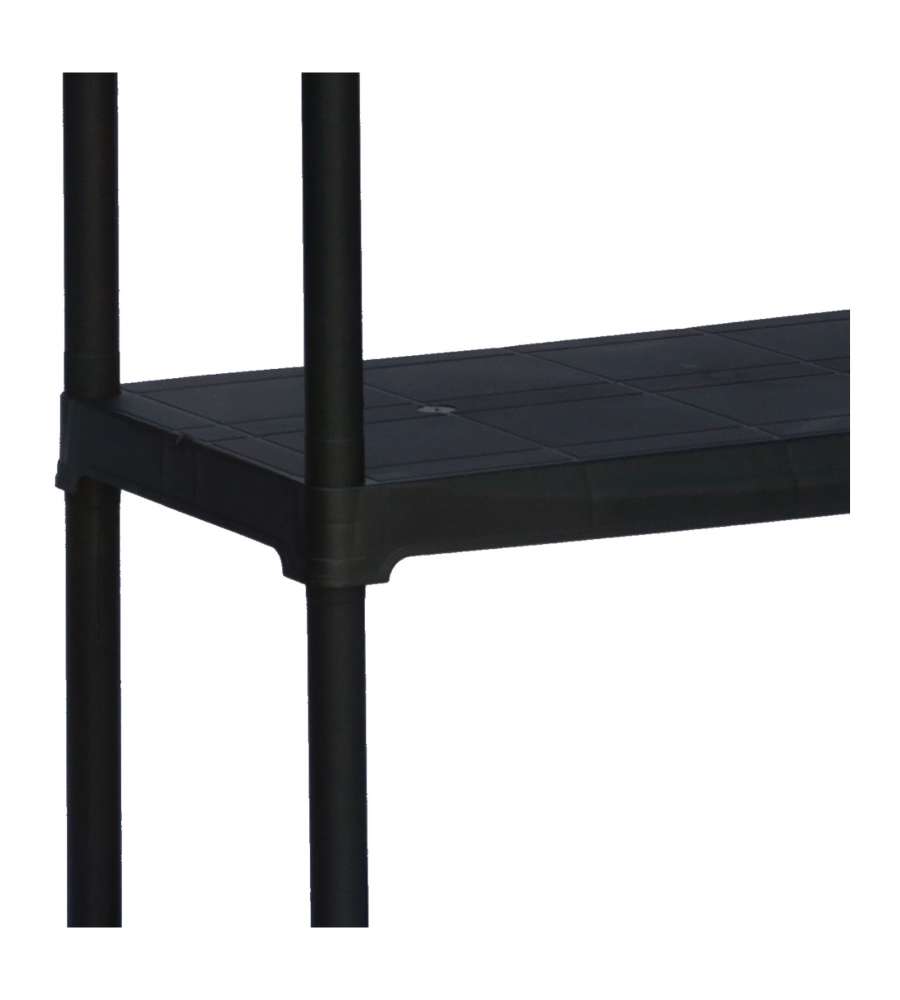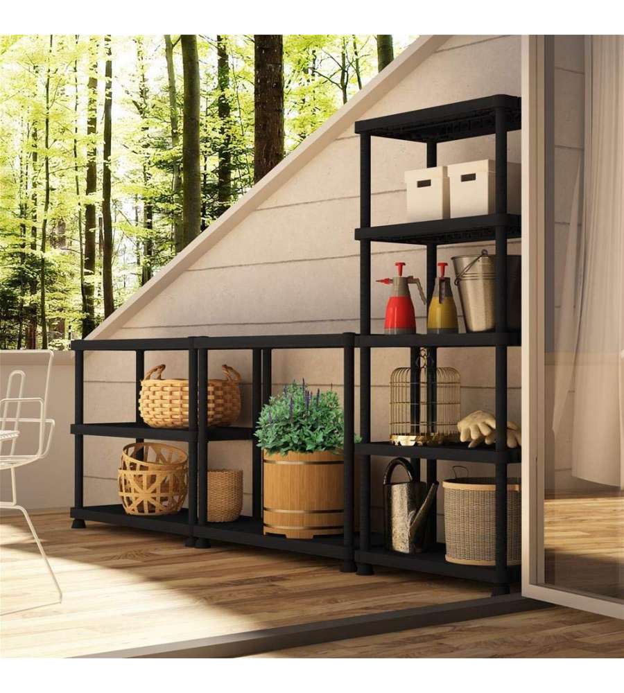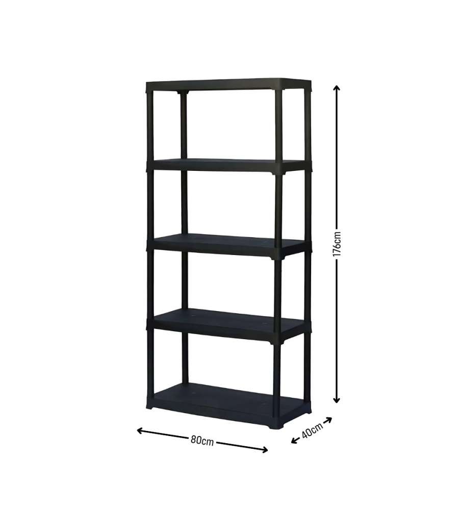 Descrizione: Scaffale Art Plast nero in polipropilene, 5 ripiani, 80x40x176 cm, portata di 30kg per ripiano. Resistente al freddo e agli odori, facile da montare senza utensili. Ideale per garage, cantina e ogni ambiente. Fissaggio a parete incluso.
