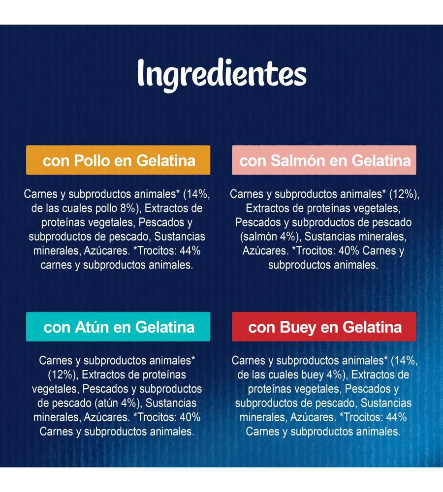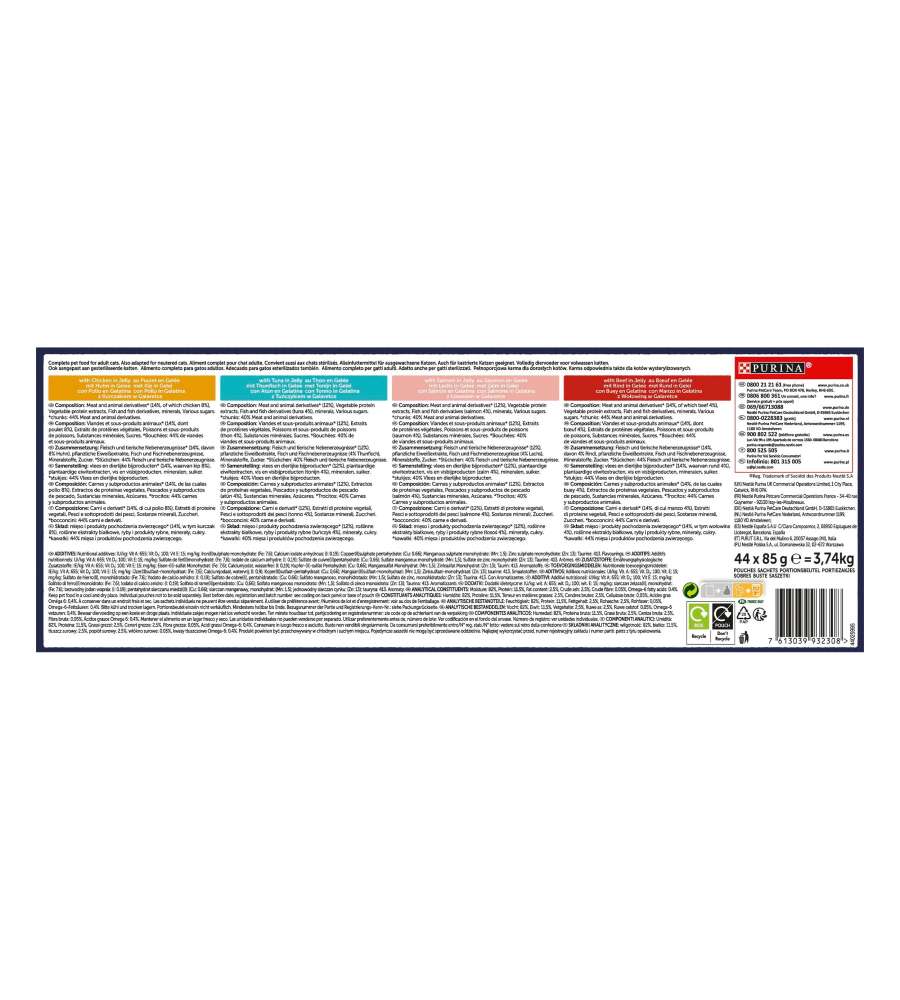Pezzettini di carne per gatti in gustosa gelatina, disponibili in 4 gusti: manzo, salmone, pollo e tonno. Confezione da 44 bustine da 85 g ciascuna, ricca di proteine. Senza aromi, conservanti e coloranti artificiali aggiunti.Ingredienti principali: