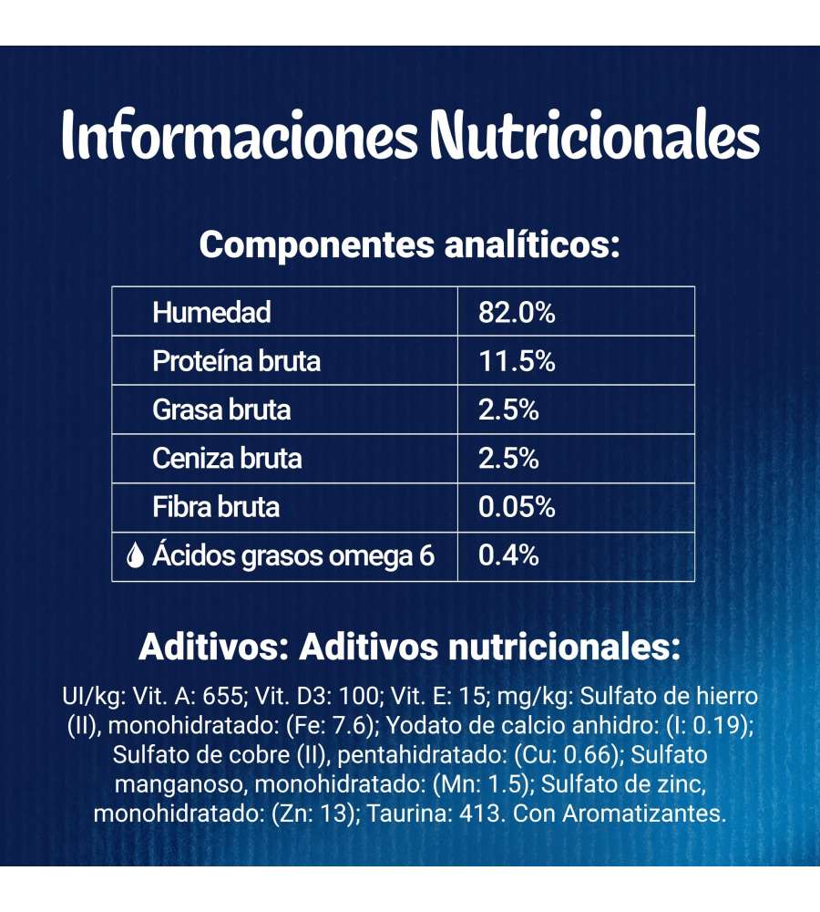 Tonno Carne e derivati* (12%). Salmone Carne e derivati* (12%). Manzo Carne e derivati* (14%, di cui 4% manzo). Pollo Carne e derivati* (14%, di cui 8% pollo).Composizione: