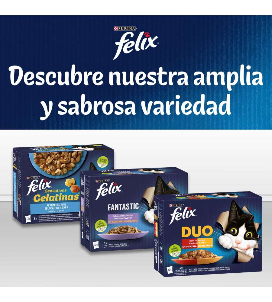 Descrizione: Scopri Felix Le Ghiottonerie in una maxi confezione conveniente: 44 bustine di bocconcini per gatti in gusti irresistibili come manzo, salmone, pollo e tonno. Pezzettini di carne in gelatina, un delizioso pasto per il tuo felino!