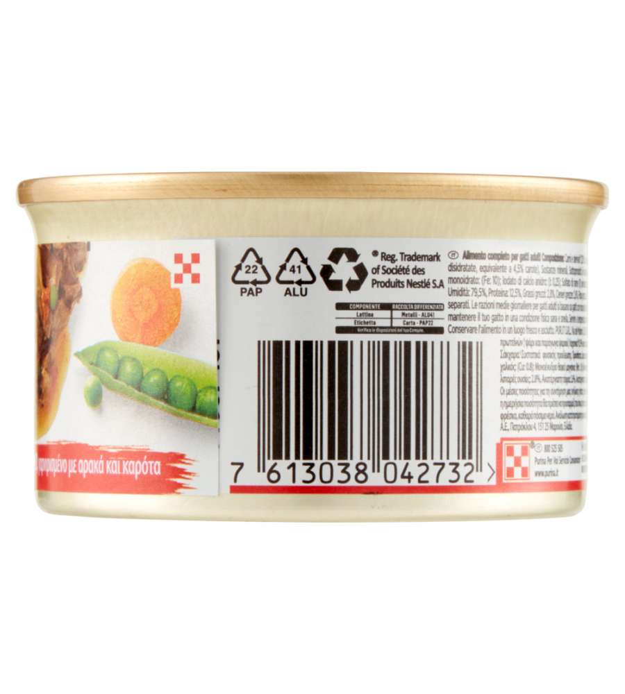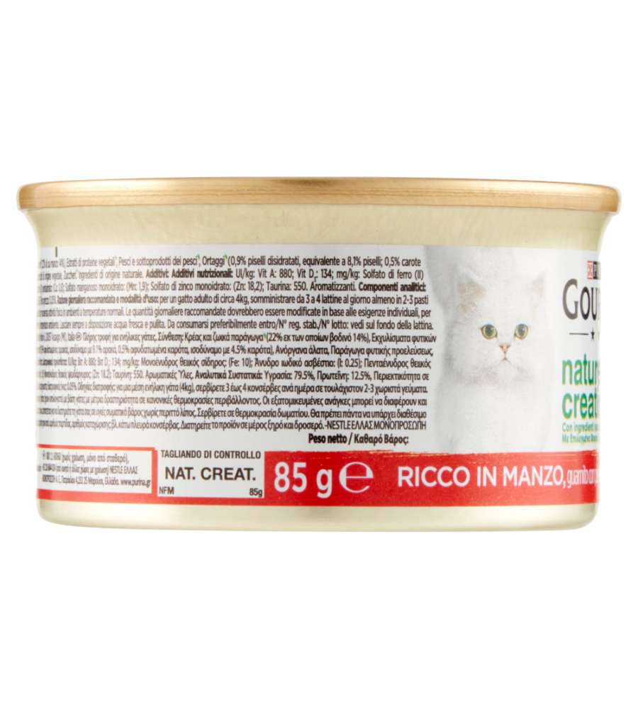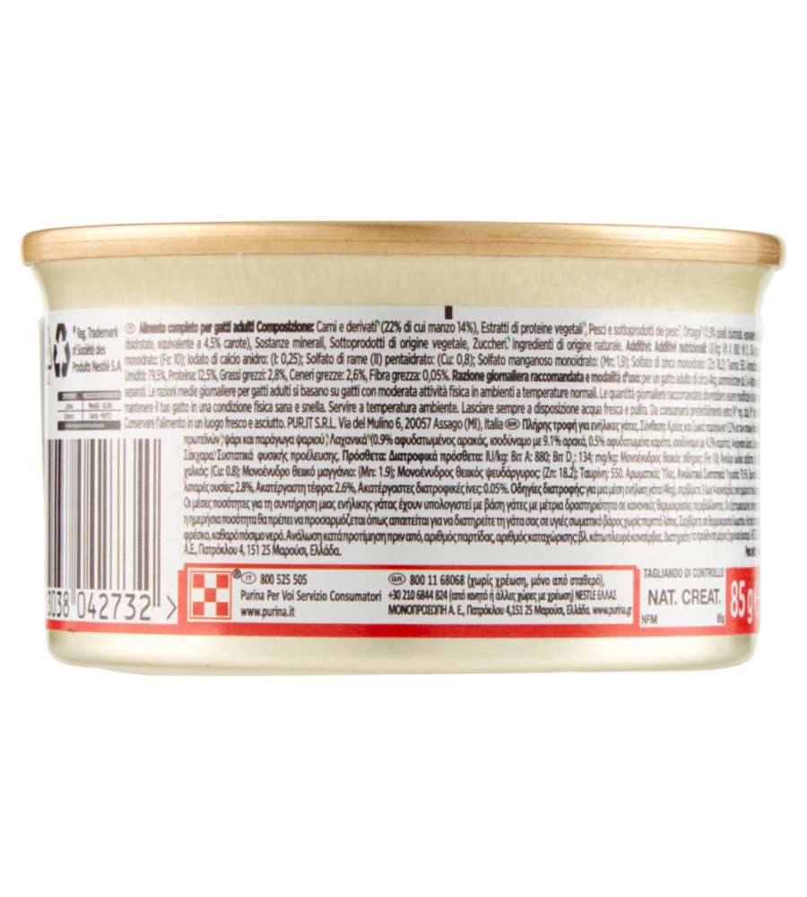 Mousse umida Purina Gourmet Gold con manzo, 85g. Nutrizione completa per gatti adulti, alta digeribilità e texture cremosa. Ingredienti selezionati arricchiti con vitamine e minerali. Ideale per gatti sensibili e schizzinosi.Ingredienti principali: