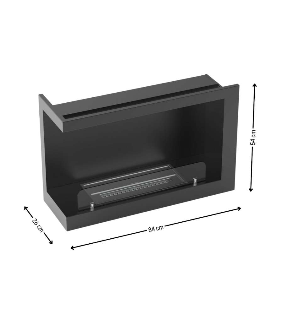 Inserto per camini a bioetanolo con apertura laterale sinistra, dimensioni 84x54x26 cm, bruciatore da 3,5 lt con durata di combustione 5h 30min e potenza di riscaldamento 4,11 kW/h. Installabile in muro o cartongesso.Destinazione d'uso: