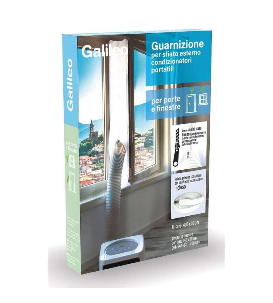 Aumenta l'efficienza del tuo condizionatore portatile con la guarnizione finestra Galileo. Realizzata in poliestere 190T (80%) e nylon (10%), questa guarnizione si adatta facilmente a tubi di diversi diametri grazie alla pratica chiusura lampo centrale a doppia direzione, permettendo l'inserimento del tubo per l'evacuazione dell'aria calda all'esterno. Questa soluzione migliora l'efficienza del condizionatore portatile, riducendo il consumo energetico e aumentando la potenza di raffreddamento. È perfetta per l'uso sia in estate che in inverno e il montaggio è semplice e veloce, poiché fornita con un nastro di installazione (circa 9,9 m).