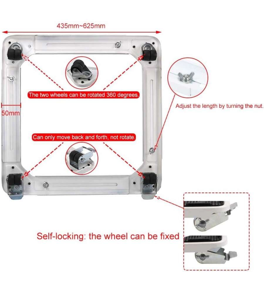 Descrizione: Carrellino regolabile da misura 435 a 630 mm. Capacità di carico 100kg. Dotato di quattro coperture antiscivolo, 4 coppie di ruote e 2 freni.