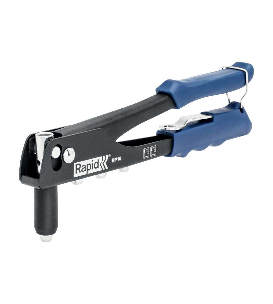 Rivettatrice manuale ergonomica RP10 con impugnatura soft-grip, ugelli intercambiabili da 3.2 a 4.8mm e 100 rivetti in alluminio di diverse dimensioni. Ideale per riparazioni su lamiere e cuoio, garantisce comfort e versatilità.Garanzia: