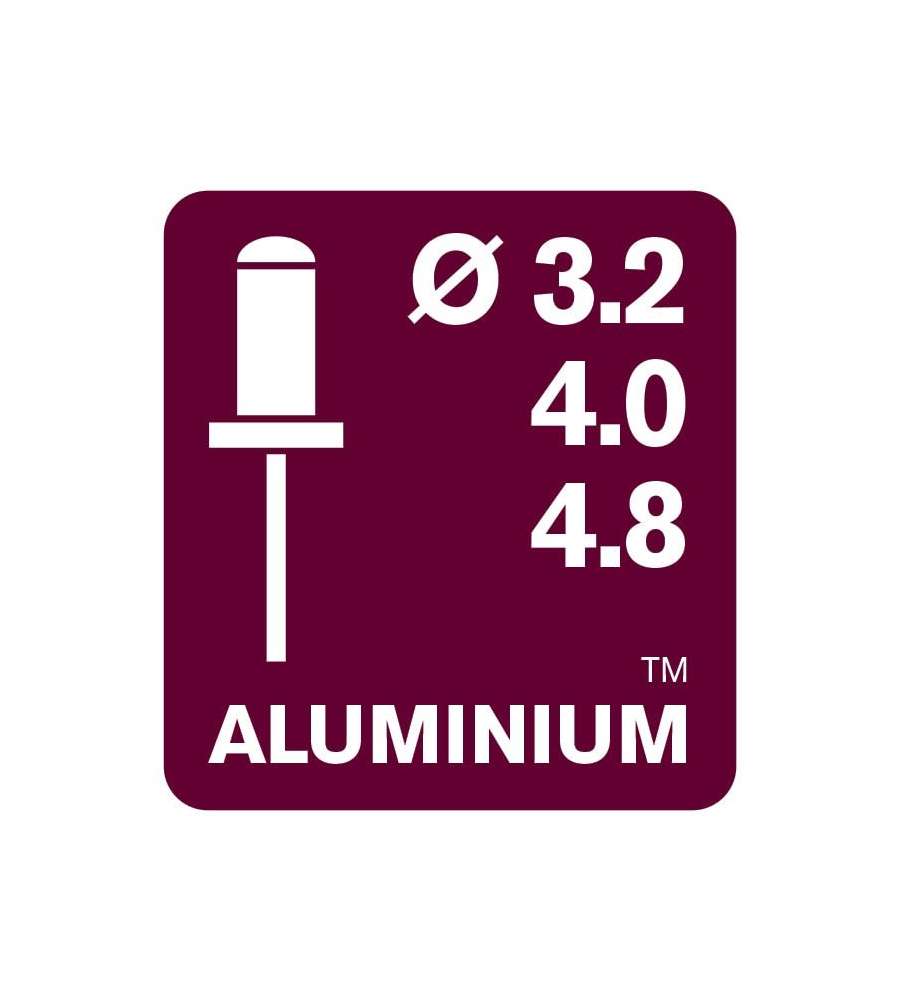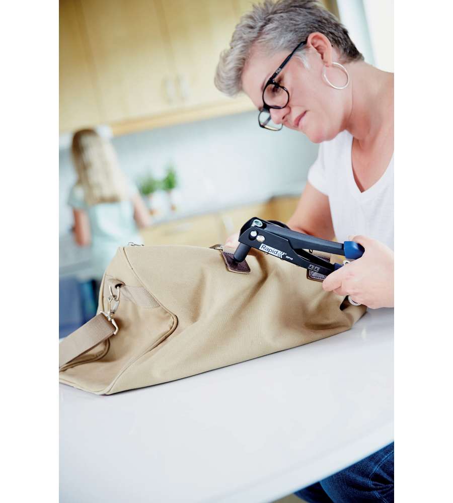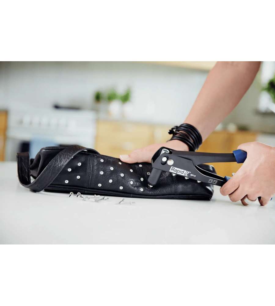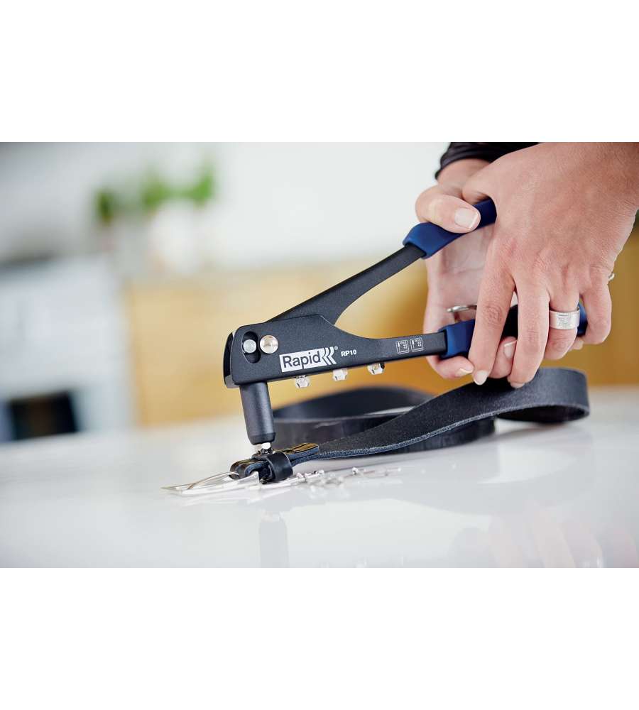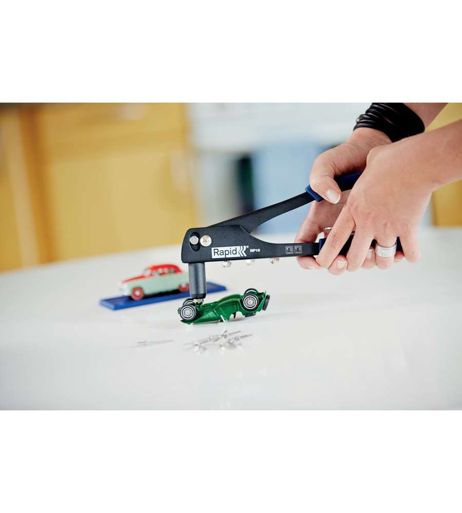 Descrizione: Rivettatrice manuale RP10 Rapid con manici ergonomici soft-grip e 100 rivetti in alluminio di diverse misure. Ideale per riparazioni su lamiere e cuoio, con ugelli intercambiabili da 3.2 a 4.8mm.