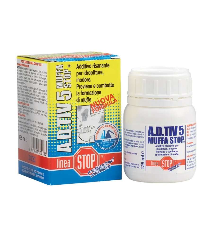 Descrizione: Additivo antimuffa Dixi TIV 5, flacone da 125 ml, trasforma l'idropittura in antimuffa inodore. Previene la formazione di muffe senza alterare il colore. Effetto risanante. Ideale per interni ed esterni.
