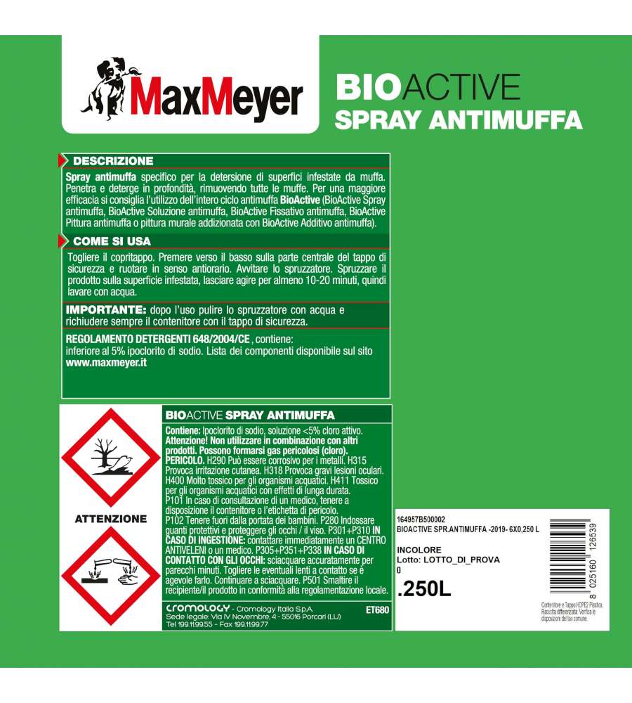 Spray Antimuffa BioActive Max Meyer 250ml: elimina efficacemente la muffa in ambienti umidi, ideale per muri. Applicazione diretta, essiccazione rapida (10-12 min), non ingiallisce. Made in Italy, senza profumo.Made in Italy:
