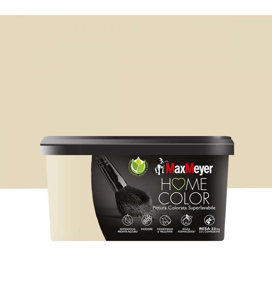 Idropittura Max Meyer Home Color, 2.5 L, colore Canapa. Superlavabile, finitura vellutata, resistente a macchie e graffi. Inodore, per interni, applicazione a pennello e rullo, categoria A+ per emissioni.Applicazione: