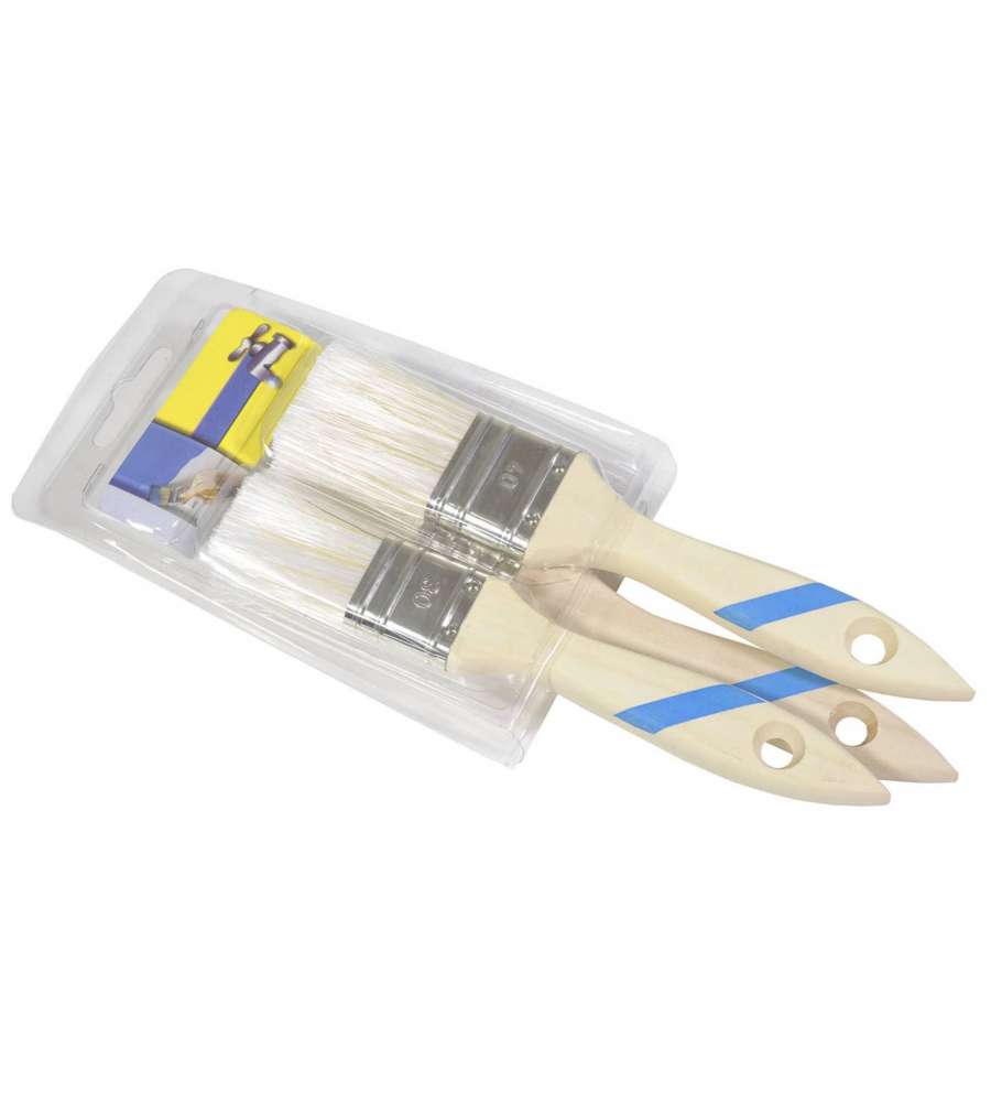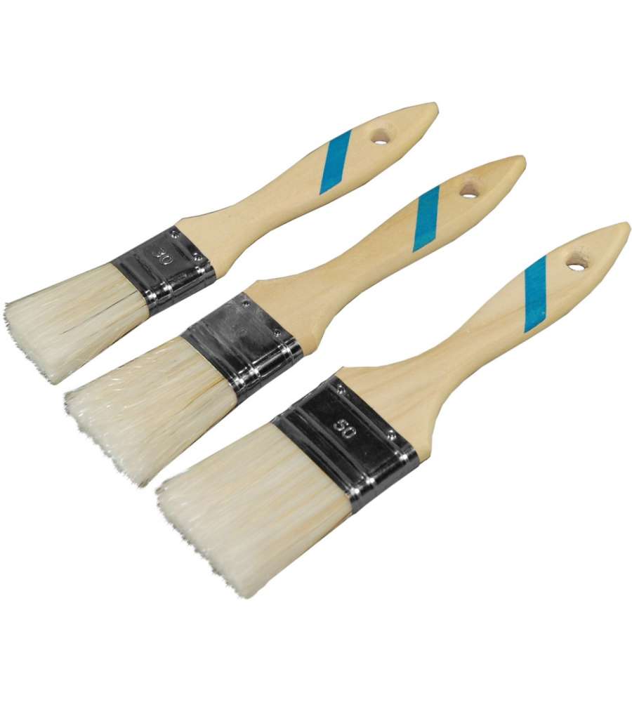 Set di 3 pennelli per smalto all'acqua con manico in legno marrone e blu. Setole in fibra sintetica bianca. Misure: 30, 40, 50 mm.