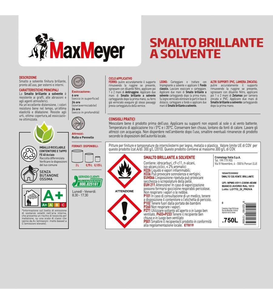 Smalto a solvente MaxMeyer Avorio R1013, 0,75 l. Pronto all'uso, per interni ed esterni. Offre ottima copertura, resistenza a graffi, abrasioni e agenti atmosferici. Applicabile su ferro, legno, lamiera zincata, PVC.Made in Italy: