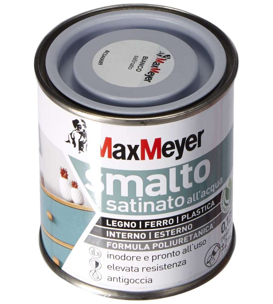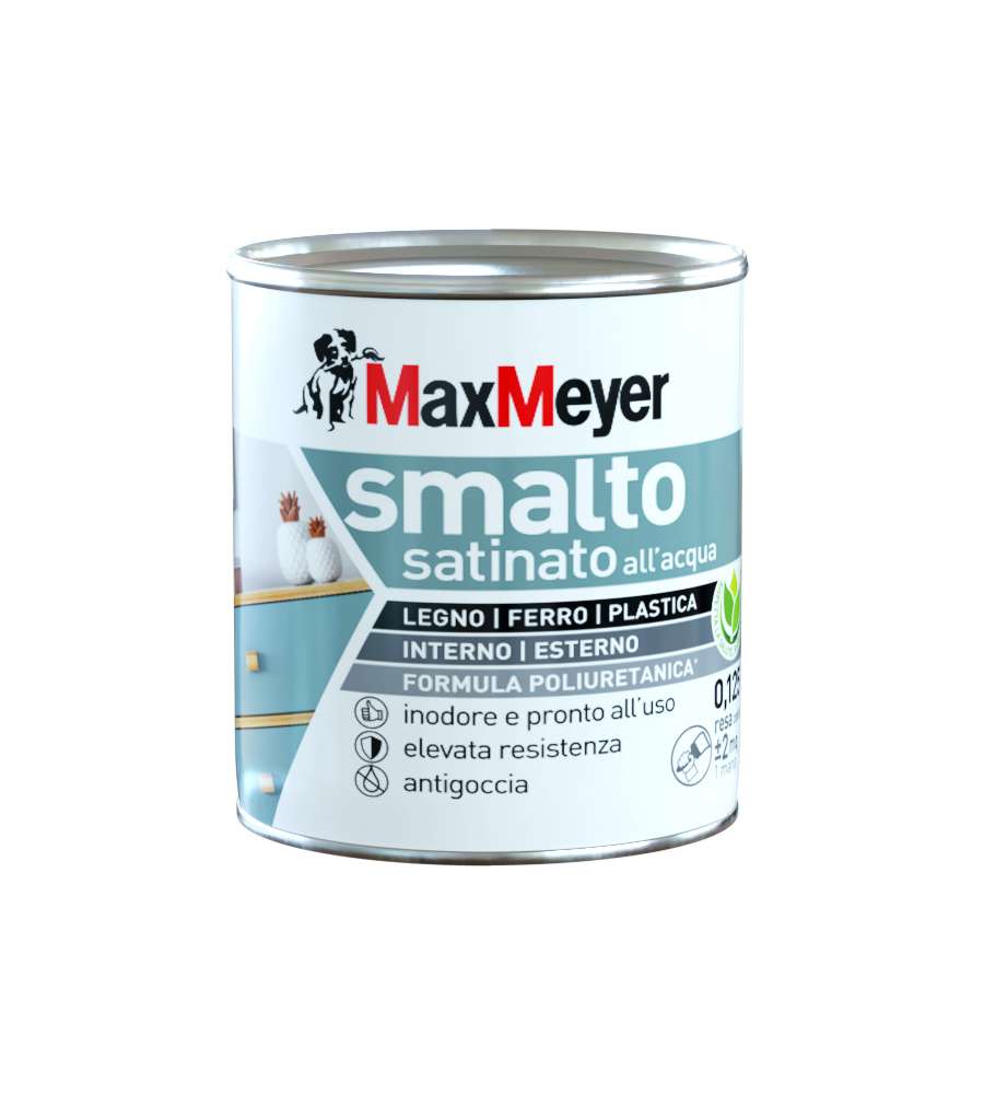 Descrizione: Smalto MaxMeyer poliuretanico satinato in confezione da 0,125 litri. Ideale per legno, ferro e plastica, per interno ed esterno.
