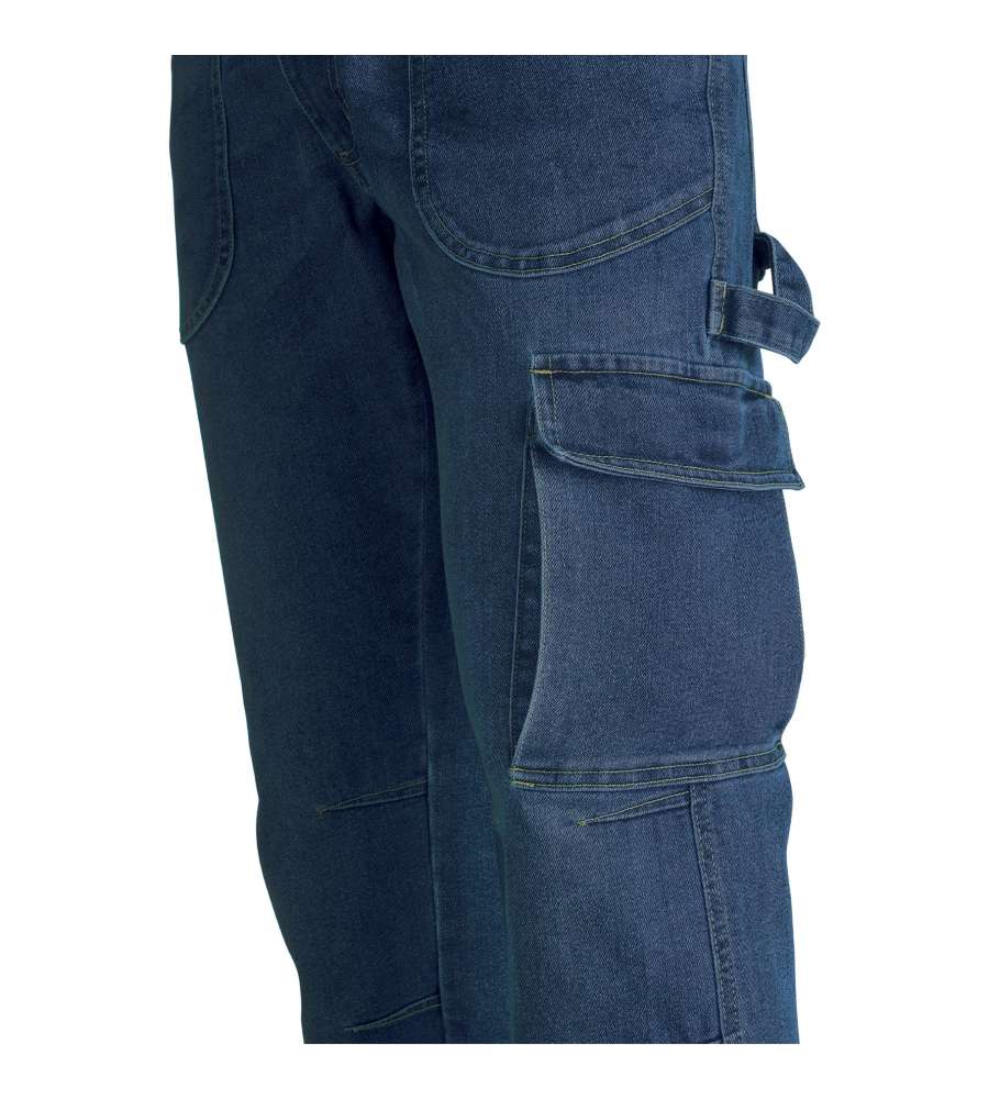 Pantaloni da lavoro XXL in denim elasticizzato, con tasche porta utensili e tasche cargo con chiusura in velcro. Comfort e durata garantiti, regolazione in vita e cuciture rinforzate per resistenza a polvere e sfregamenti.