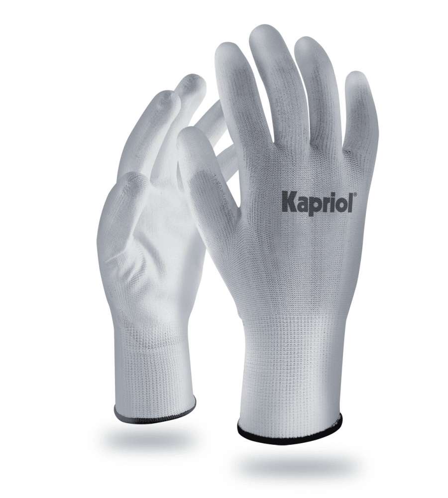 Guanti di precisione Kapriol Skin White, misura 10, realizzati in poliestere con spalmatura in poliretano. Ideali per lavori su superfici delicate, garantiscono protezione senza macchiare. Comfort e praticità per ogni attività.