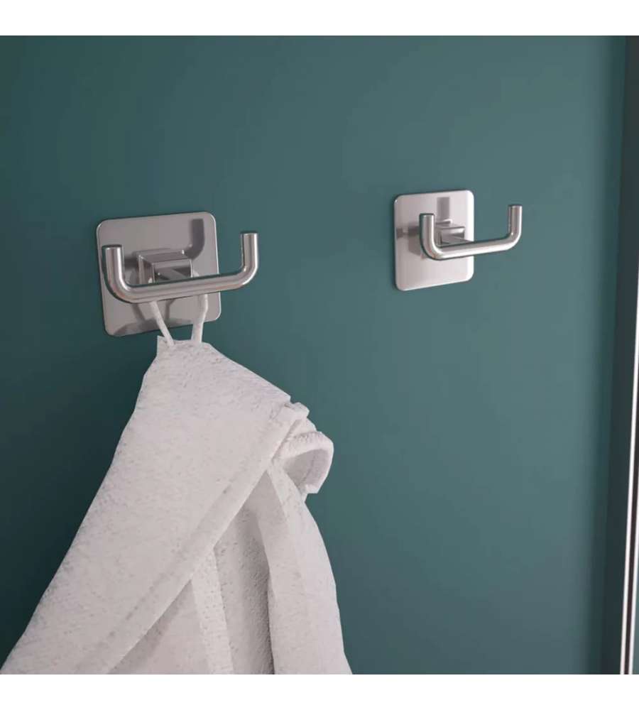 Appendino doppio in metallo cromato lucido, dimensioni 6,5x4xh5,3 cm. Design moderno e salvaspazio, ideale per appendere asciugamani e accappatoi. Facile installazione con biadesivo o viti, perfetto per ogni bagno.Altro 1: