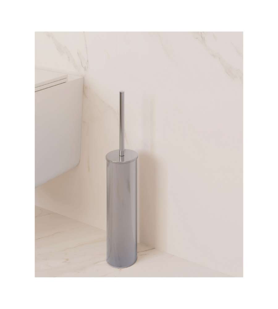 Portascopino da terra elegante in cromo, diametro 7,6 x altezza 39,5 cm, realizzato in acciaio inox AISI 304 per resistenza e igiene. Contenitore interno in ABS lavabile per una pulizia facile. Ideale per bagni moderni e raffinati.