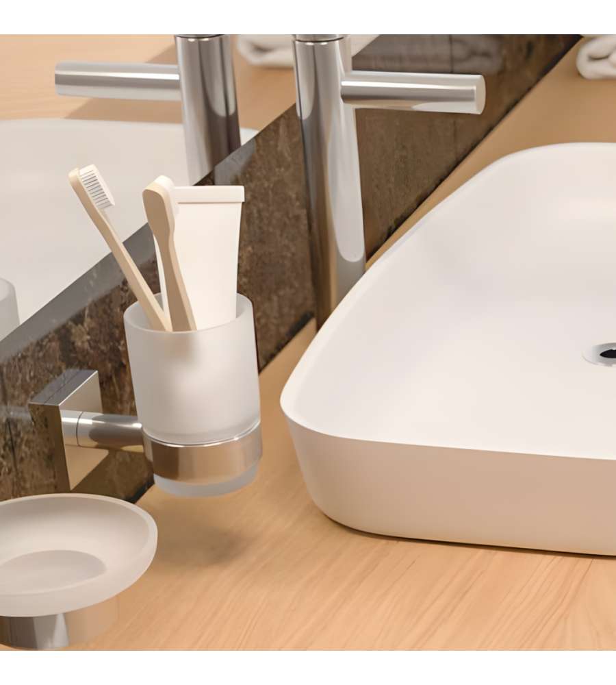 Portaspazzolini elegante con finitura in cromo lucido, dimensioni compatte di 7x10x11,5 cm. Perfetto per bagni moderni, facile da pulire e resistente. Fissaggio a muro con viti o bioadesivo pre-fissato. Un accessorio che unisce funzionalità e stile.