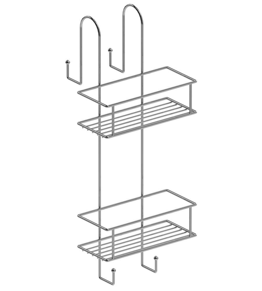 Contenitore a gancio in acciaio cromato, design autocentrante, adatto a box doccia con profilo fino a 5 cm. Include 2 cestelli distanziati per flaconi maxi e ganci per spugna e accappatoio. Dimensioni: 22x54,5x21 cm.Altro 1: