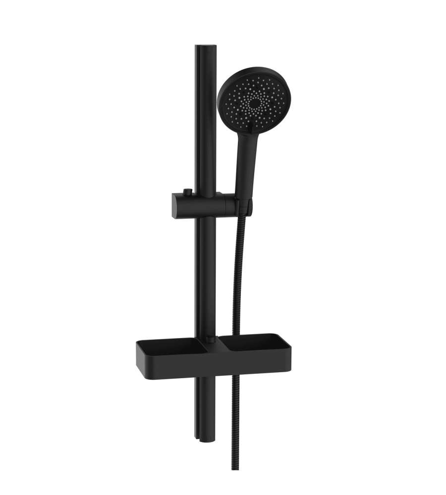 Set saliscendi in metallo nero con doccia 3 getti anticalcare Ø 12 cm, guarnizione risparmio acqua (9 l/min), attacco universale 1/2", asta da 68 cm, flessibile acciaio 150 cm, mensola porta oggetti inclusa, fissaggio biadesivo o con viti.Altro 1: