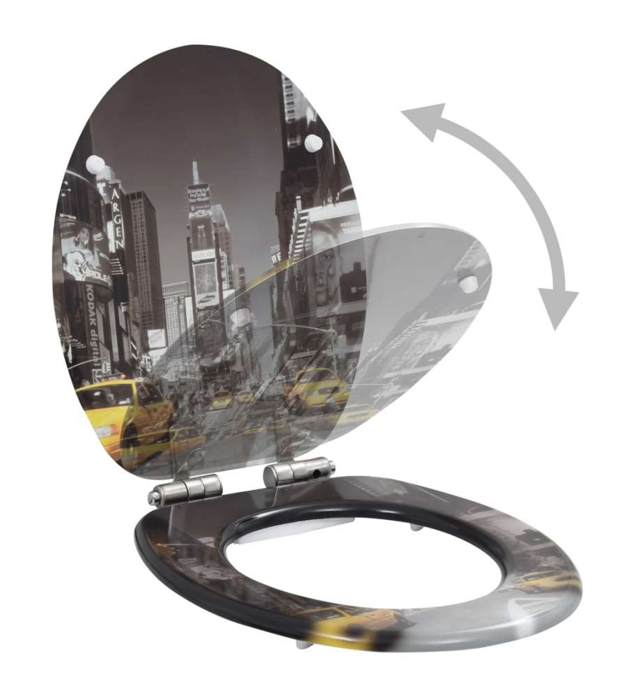 Con un'immagine di New York Con funzione a chiusura rallentata Le cerniere possono essere regolate da 12 a 20 cm di larghezza Universale, adatto a tutti i WC standard La consegna include 2 sedili per WC con coperchio
