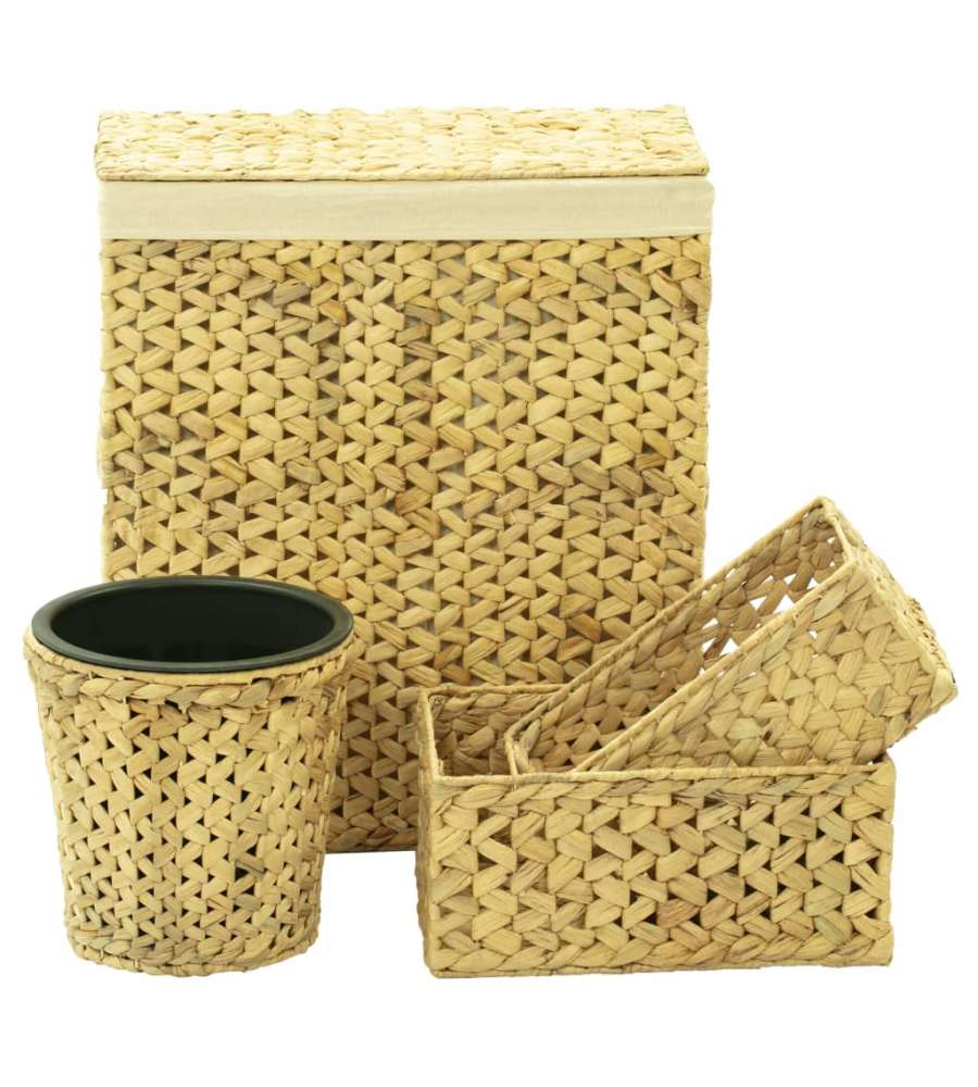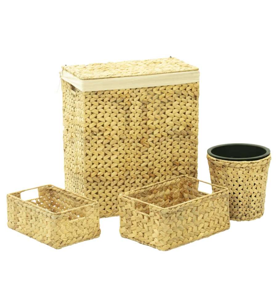 Realizzati in giacinto d'acqua con un robusto telaio in ferro, il cesto della biancheria, i contenitori rettangolari e la pattumiera sono robusti e resistenti. I grandi scomparti offrono ampio spazio per riporre il bucato, organizzare i prodotti di uso quotidiano e buttare la spazzatura. L'attraente stile intrecciato aggiunge un tocco di fascino rustico al set.
