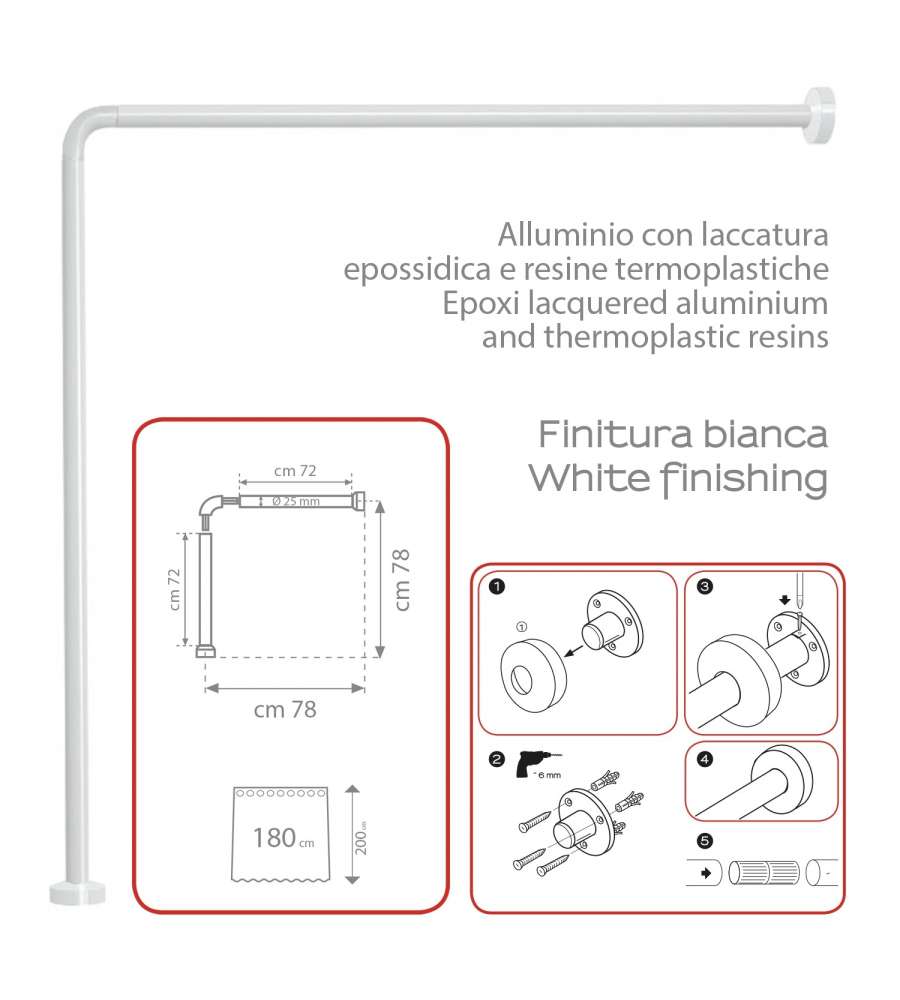 Asta angolare universale in alluminio bianco, dimensioni 81x81 cm e diametro 6,2 cm. Resistente e leggera, ideale per cabine doccia 80x80 cm. Design elegante, facile installazione e compatibile con diverse tende da doccia.Garanzia:
