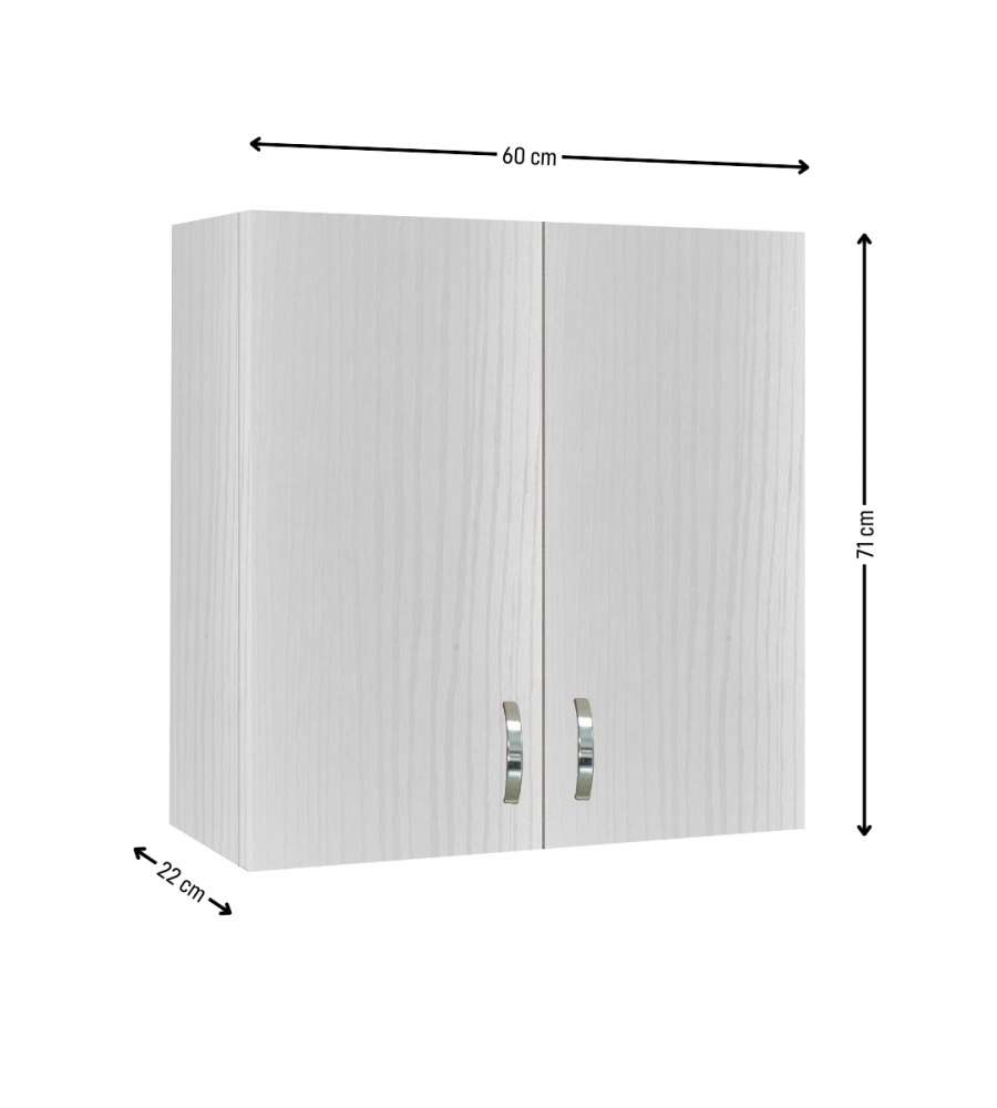 Mobile sospeso da bagno con due ante, finitura bianco nordico. Dimensioni 60x22x71 cm, ripiano interno in vetro, maniglie cromate. Realizzato in truciolare nobilitato per resistenza e stile. Ideale per ottimizzare lo spazio.