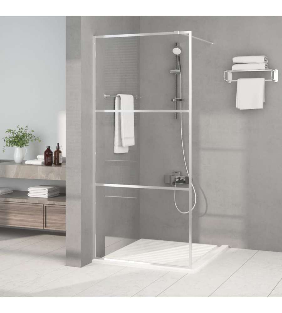 Colore telaio: Argento Materiale: Vetro temperato trasparente ESG, alluminio Dimensioni: (89-90)x195 cm (LxA) Spessore vetro: 5 mm Telaio regolabile in larghezza di 1 cm Lunghezza della barra di supporto: 100 cm (senza regolazione)Altro 6: