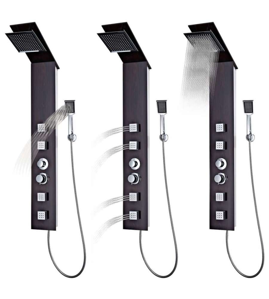Il pannello ? realizzato in vetro di alta qualit? con eleganti venature simili al legno. Ha tre funzioni: pioggia, cascata, idromassaggio e doccia a telefono che possono essere facilmente selezionate tramite un pomello.