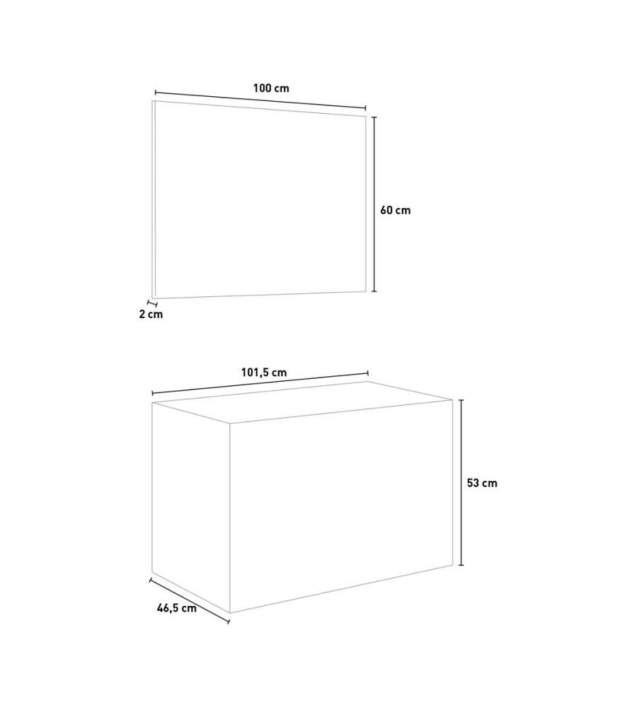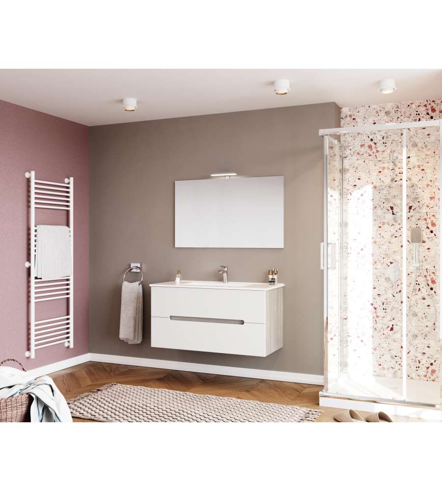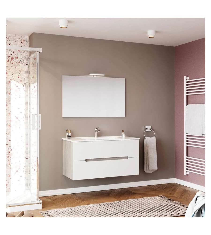 Mobile bagno sospeso bicolore 100 cm con lavabo in ceramica e specchio con lampada LED. Struttura in legno nobilitato, 2 cassetti scorrevoli soft-close, design elegante e durevole, resistente all'umidità. Rubinetteria non inclusa.Altro 1: