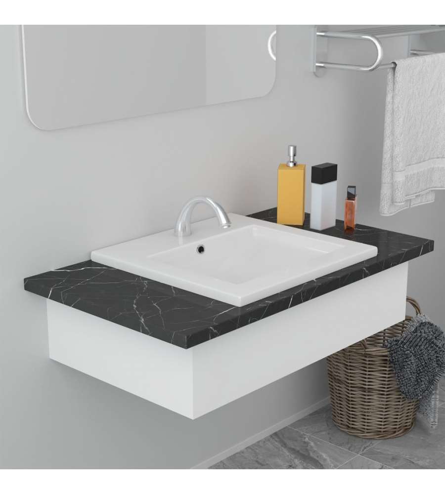 Colore: Bianco Materiale: Ceramica Dimensioni complessive: 42x39x18 cm (LxPxA) Spessore bordo in ceramica: 4 cm Diametro del foro di scarico: 4,5 cm Con foro di trabocco