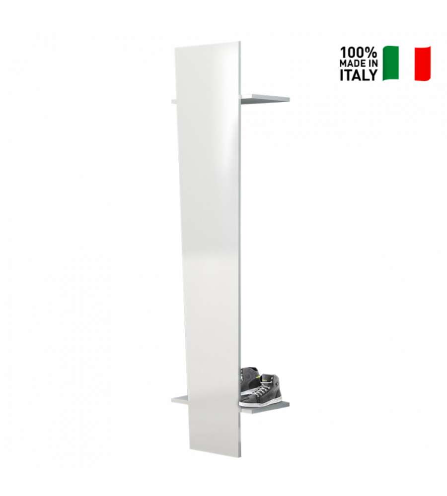 Struttura in legno particellato certificato FSC. Superficie in melaminico dal color bianco laccato lucido. Pannello frontale dal taglio diagonale. 2 ripiani nel retro e 1 tubo appendiabiti centrale.I dati sottostanti riguardano la sede legale e le Informazioni correlate del produttore del prodotto.
