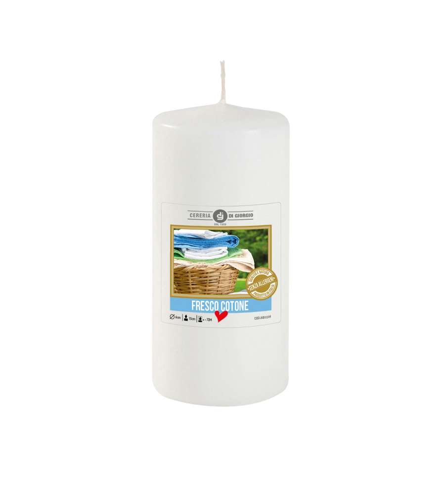Candela profumata in vetro, diametro 6 cm, altezza 15 cm. Realizzata con cera di paraffina e stoppino in puro cotone. Profumazione floreale, senza allergeni, durata 72 ore. Design minimalista, ideale per uso interno. Prodotto in Italia.Uso interno: