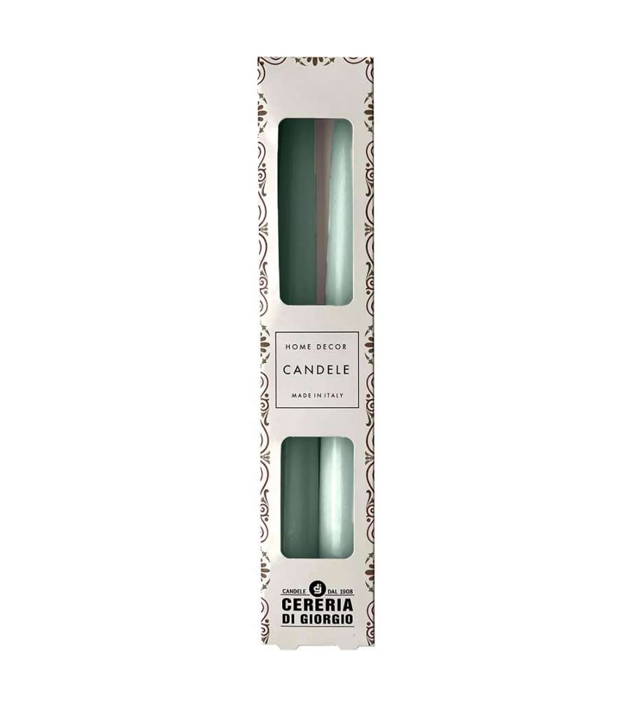 Descrizione: Candele coniche Cereria di Giorgio, in cera di paraffina, colore verde vintage. Perfette per decorazioni classiche, bruciano senza fumi e durano fino a 7 ore. Set da 2 pezzi, dimensioni 2.2x25 cm.