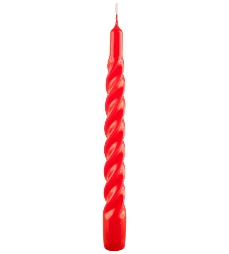 Candele laccate tortiglione in cera di paraffina, dimensioni Ø 2,2 cm e h. 21 cm, confezione da 3 pezzi, colore rosso. Ideali per creare atmosfere eleganti e rilassanti, senza fumi e senza profumo, perfette per ogni celebrazione.Uso esterno: