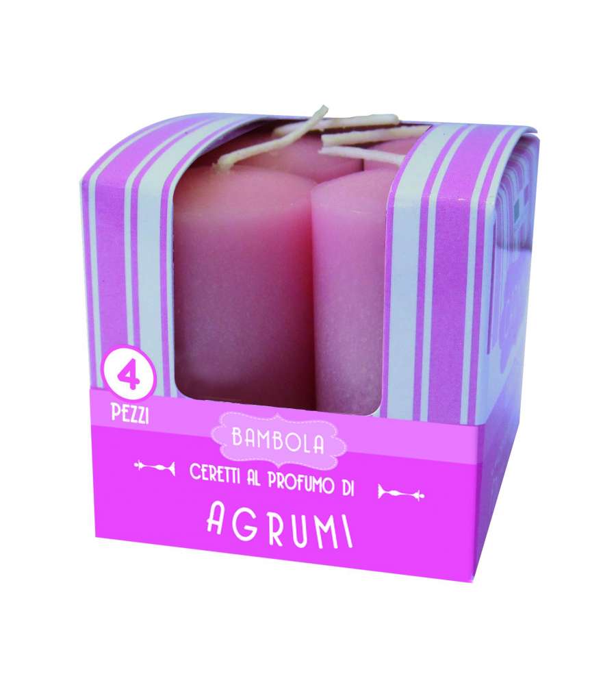 Set di 4 candele profumate in cera di paraffina con fragranza agrumi. Diametro 3 cm, altezza 5,5 cm e durata di 3,5 ore. Bruciano senza colare e senza fumo, ideali per profumare gli ambienti. Colore rosa, uso interno.Uso interno: