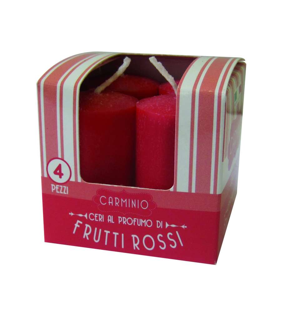 Candele profumate in cera di paraffina, set da 4 unità, fragranza Frutti Rossi, diametro 3 cm, altezza 5.5 cm. Bruciano senza fumo e senza colare, durata 3.5 ore. Ideali per ambienti interni, perfette per ogni stagione.Uso interno: