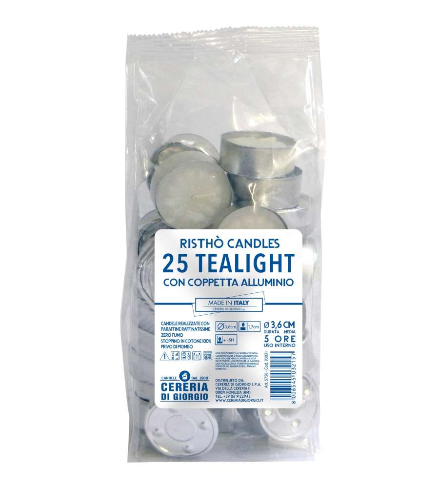 Descrizione: Candele tealight bianche, confezione da 25 pezzi, con durata di 5 ore. Ideali per ristorazione e decorazione, bruciano senza fumi. Artigianali, realizzate in Italia dal 1908. Perfette per ogni occasione.