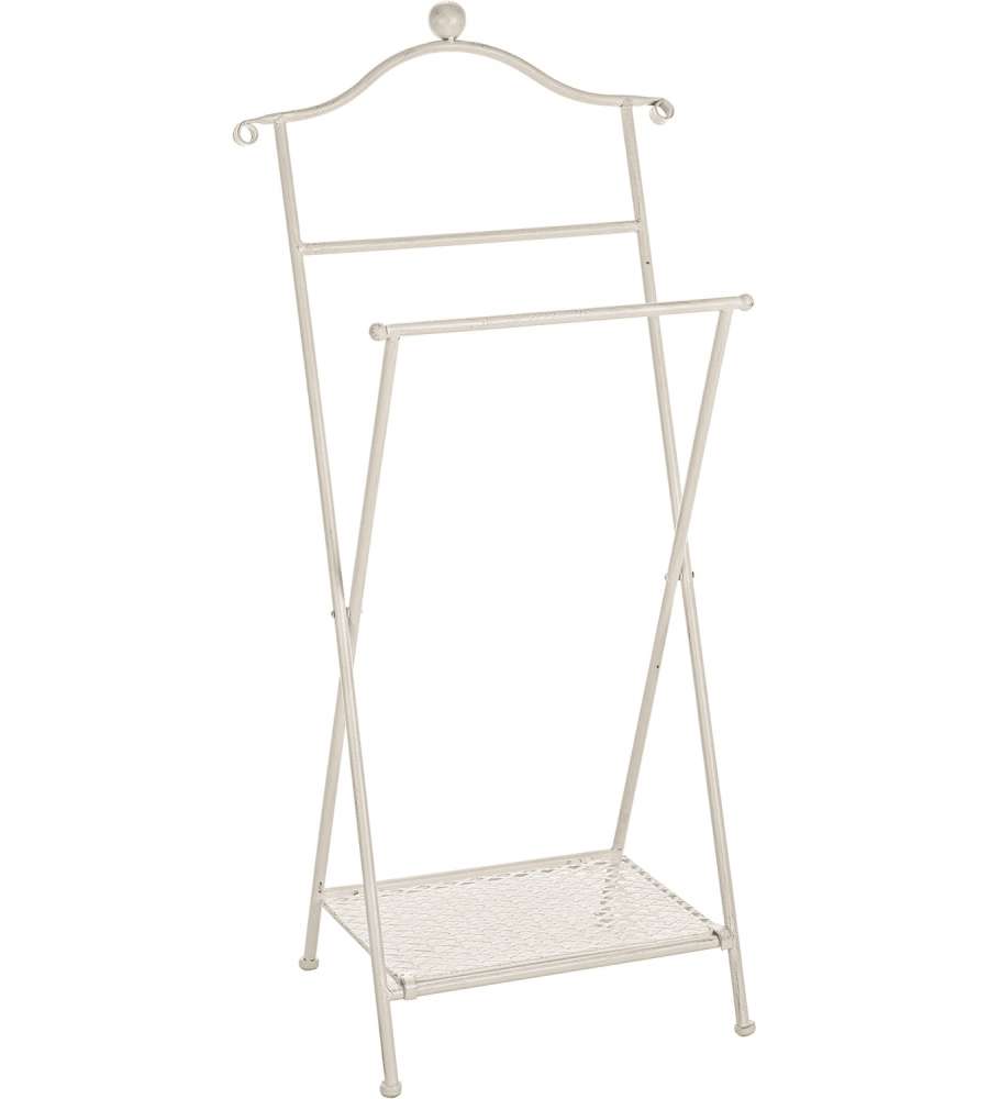 Indossatore elegante in stile shabby provenzale, realizzato in metallo bianco. Dotato di asta e ripiano, è ideale per appendere vestiti e asciugamani. Dimensioni compatte: 46x28x98 cm, pieghevole per una facile conservazione. Perfetto per la camera dRipiani: