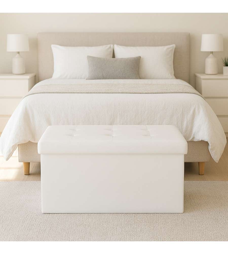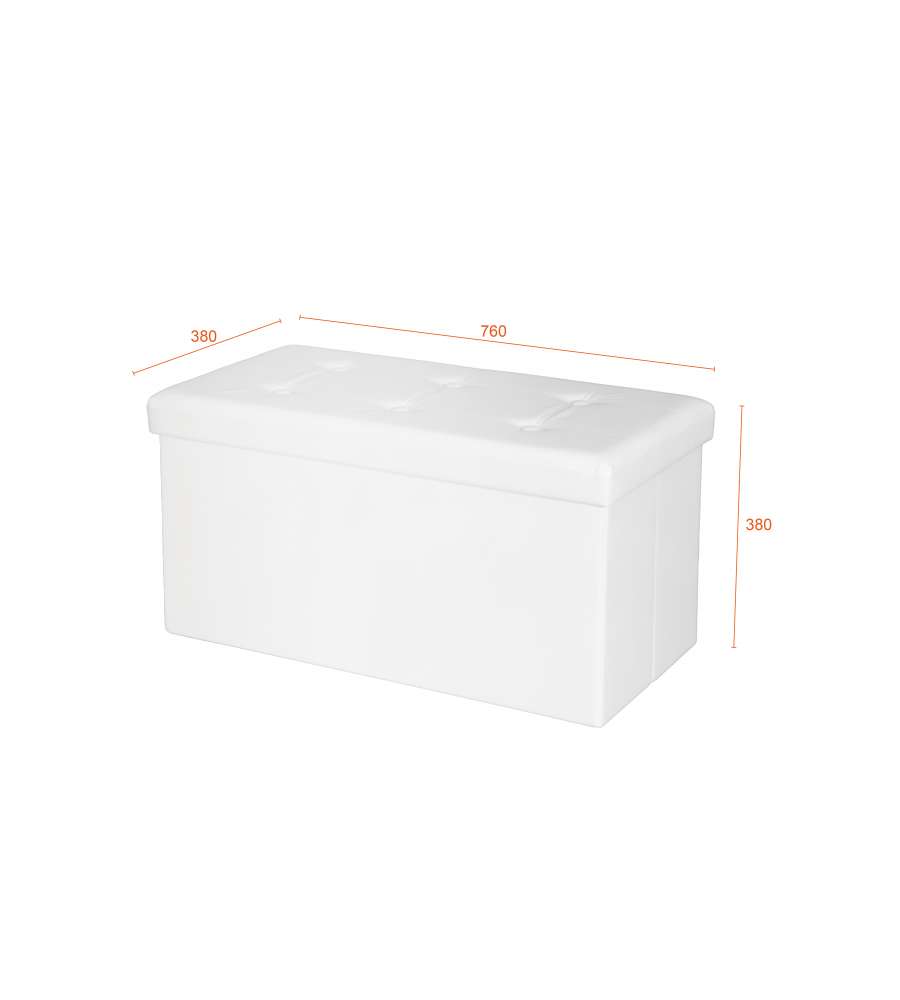 Contenitore pieghevole salvaspazio con dimensioni 76x38x38 cm, capacità 97L. Realizzato in MDF e tessuto traspirante similpelle, leggero (5,8 kg), facile da assemblare e riporre. Ideale come seduta o poggiapiedi in soggiorno, camera o ingresso.Capacità: