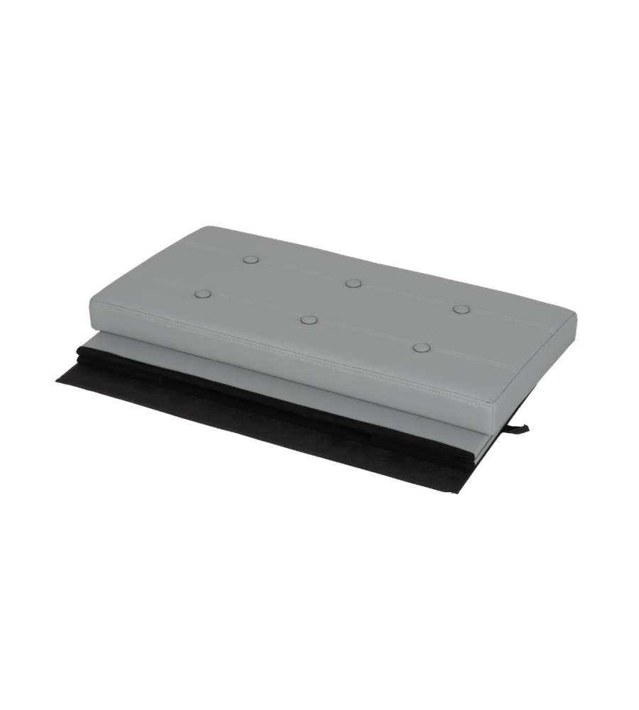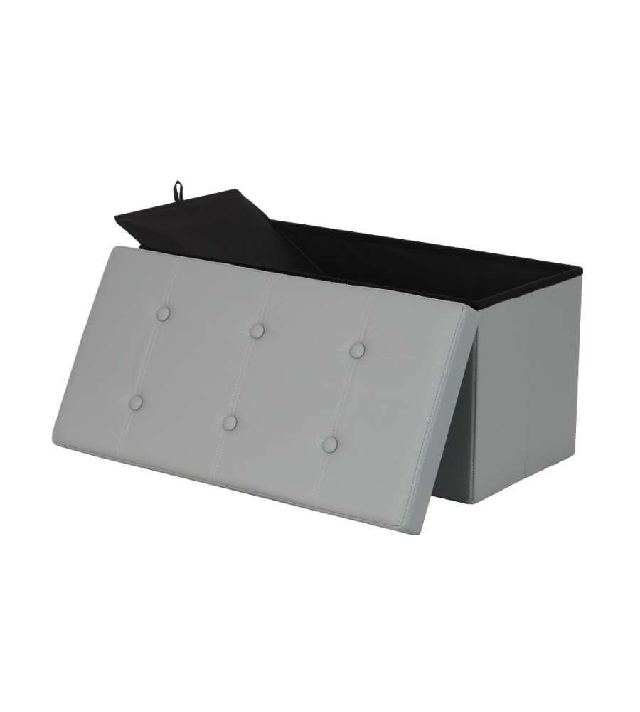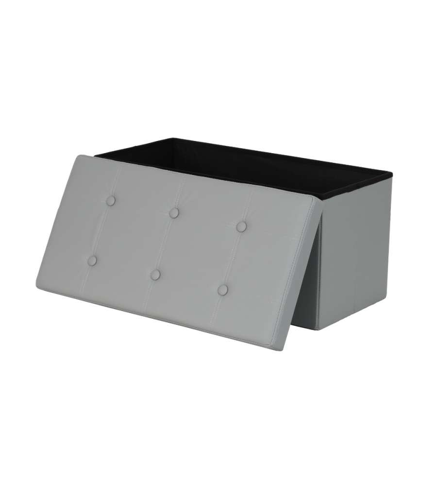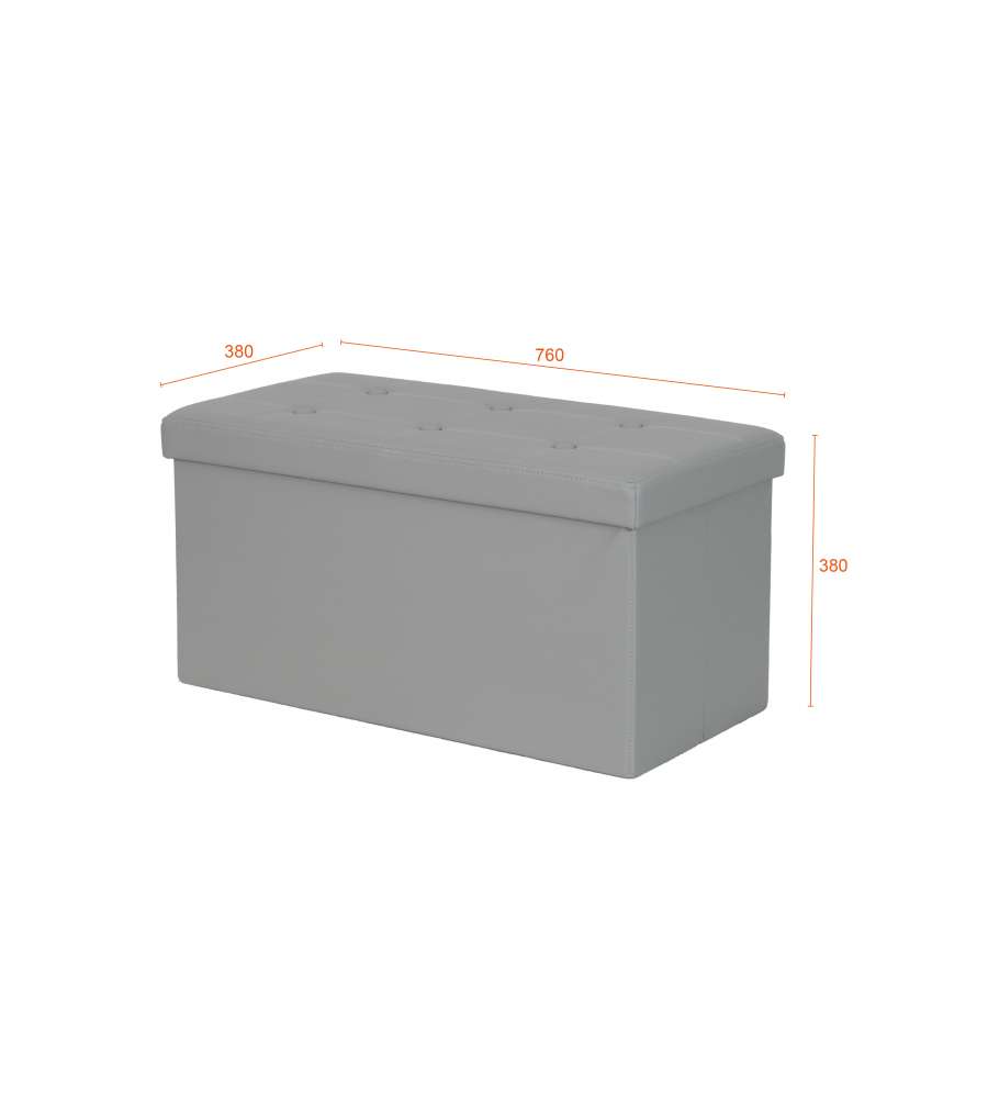 Contenitore salvaspazio pieghevole in tessuto similpelle grigio. Dimensioni 76x38x38 cm, capacità 97L, peso 5,8 kg. Utilizzabile come seduta o poggiapiedi, si assembla in meno di un minuto. Ideale per soggiorno, camera e ingresso.Capacità: