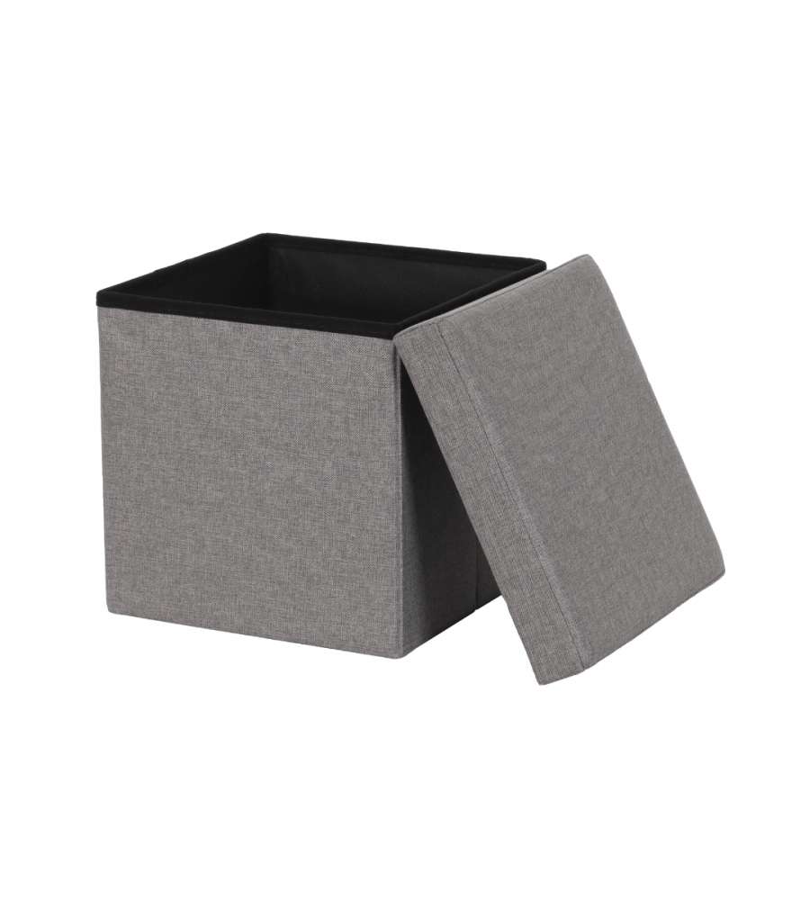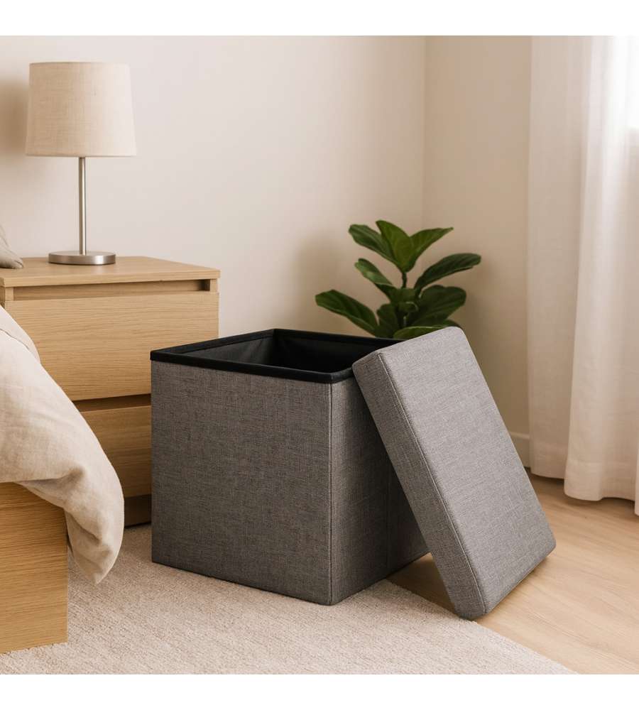 Contenitore salvaspazio pieghevole 38x38 cm, perfetto come seduta o poggiapiedi. Realizzato in poliestere e MDF, pesa solo 2,6 kg e ha una capacità di 55L. Facile da assemblare e riporre, adatto per soggiorno, camera e ingresso.Colore seduta: