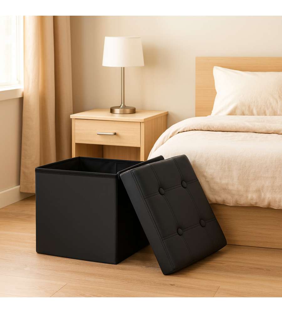Descrizione: Pouf pieghevole Domo Mea 38x38x38cm colore nero, versatile e salvaspazio. Con 55L di capacità, è ideale per libri e giochi. Leggero e facile da riporre, si assembla in meno di un minuto!