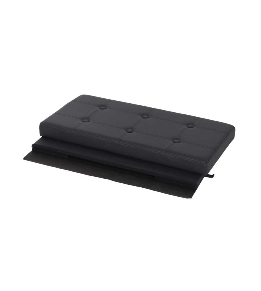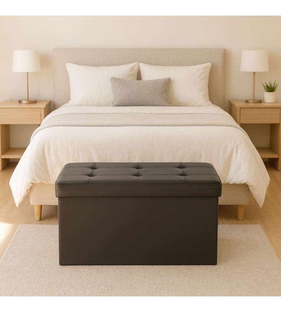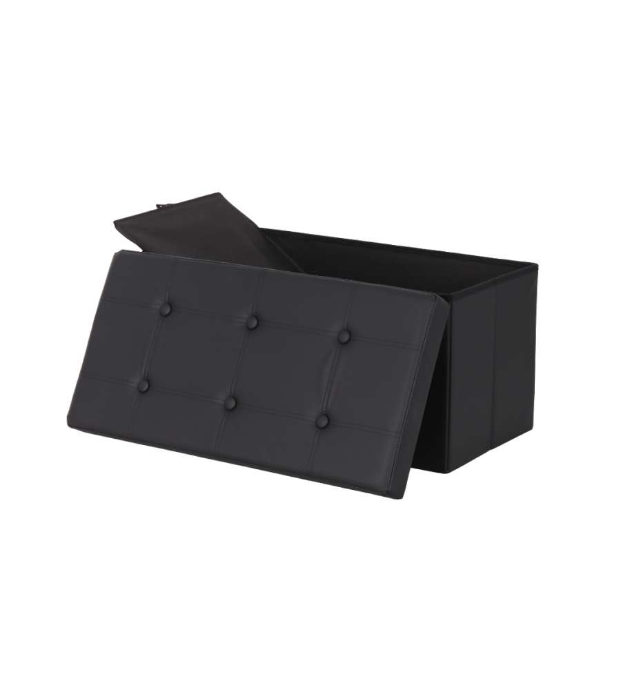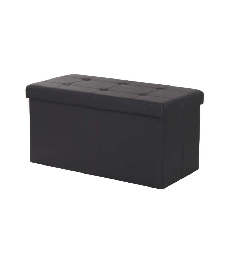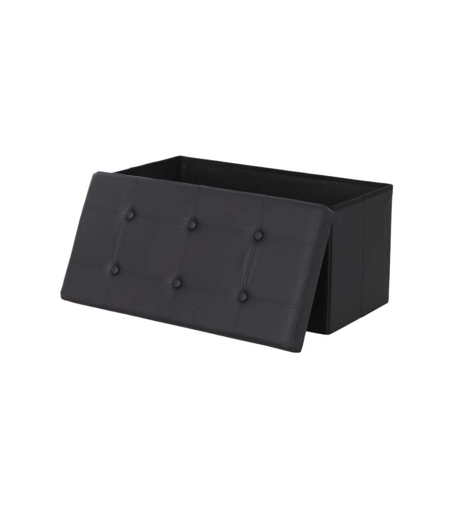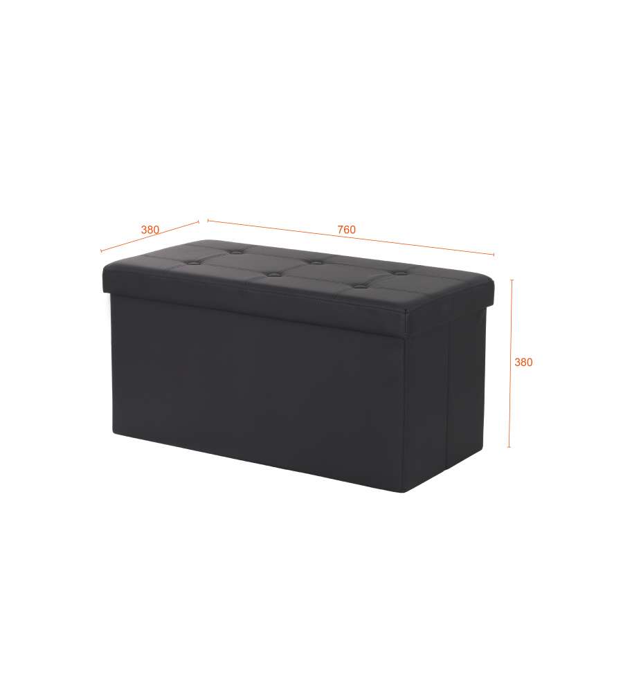 Pouf pieghevole nero, dimensioni 76x38x38 cm, capacità 97L. Realizzato in MDF con rivestimento in tessuto traspirante similpelle. Leggero e facile da riporre, ideale per contenere libri e giochi. Utilizzabile anche come seduta o poggiapiedi.Capacità: