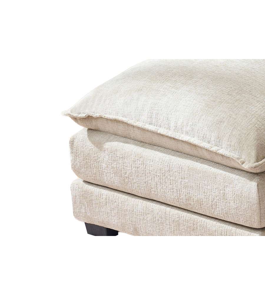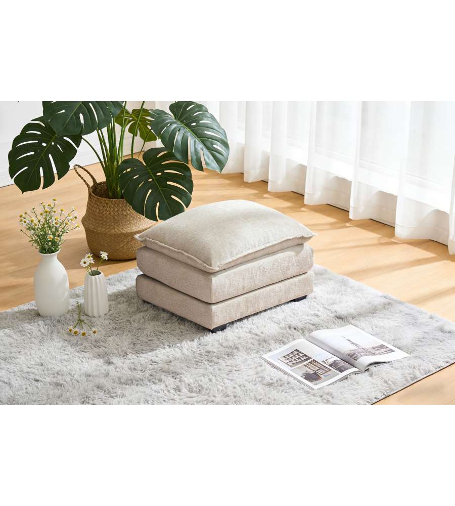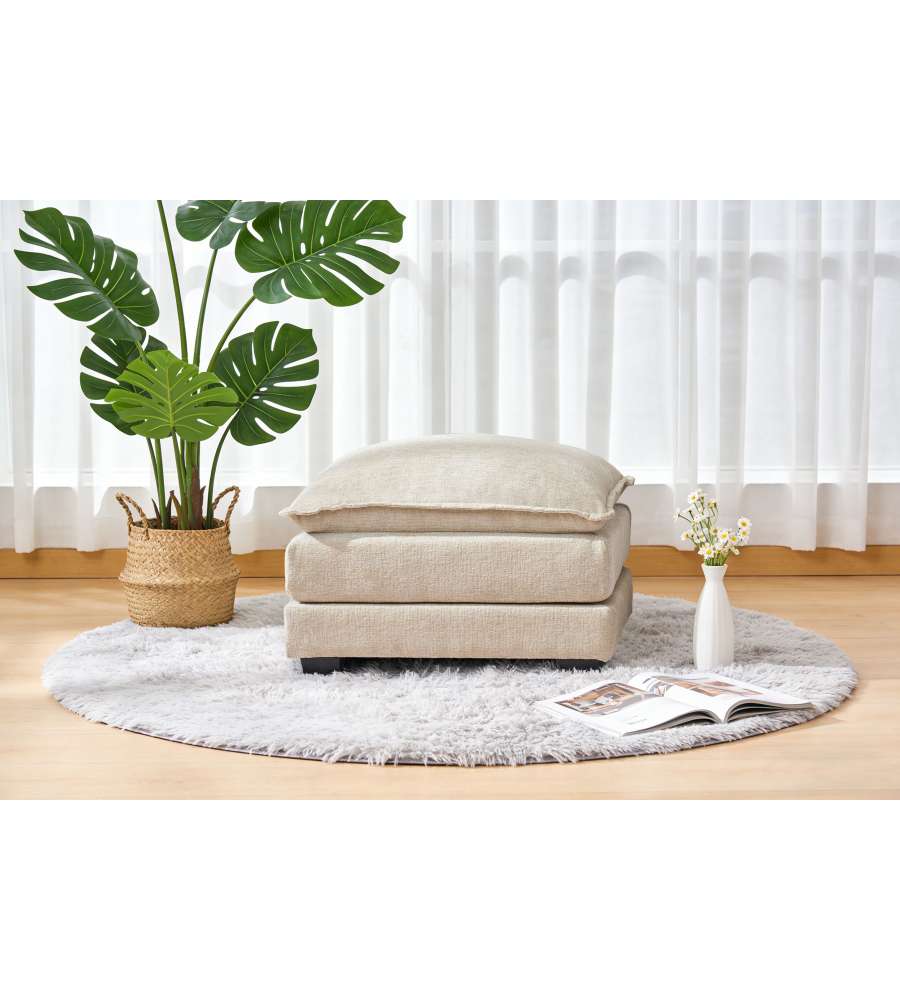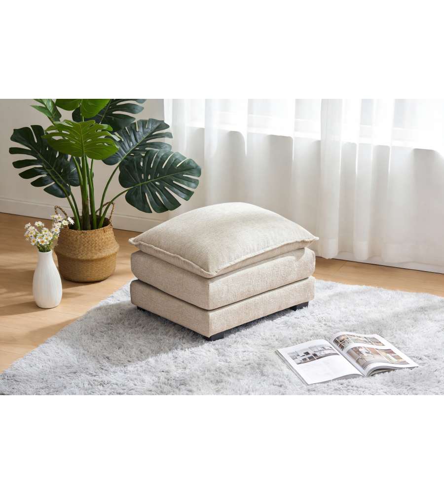 Il pouf ottomano con cuscino cloud è il complemento d'arredo ideale per chi cerca stile e comfort in un unico elemento. Il design soffice e avvolgente, caratterizzato dal maxi cuscino rifinito con bordo a rilievo sovrapposto alla seduta, richiama l'estetica dei divani cloud tanto amati nell'arredamento contemporaneo e nordico. Realizzato con struttura interna in compensato e acciaio, è dotato di molle insacchettate che garantiscono un'ottima resilienza nel tempo, mantenendo forma e comfort dopo ogni utilizzo. Il rivestimento in tessuto tono su tono color beige – dall'aspetto caldo e naturale, simile a ciniglia strutturata – si integra perfettamente con sofa modulari, divani chesterfield o ambienti in stile japandi e minimal. I piedini in plastica nera a contrasto conferiscono un tocco moderno e completano l'estetica pulita del prodotto. Il pouf viene consegnato in imballaggio sottovuoto compresso, che ne facilita il trasporto e riduce l'ingombro al momento della spedizione.